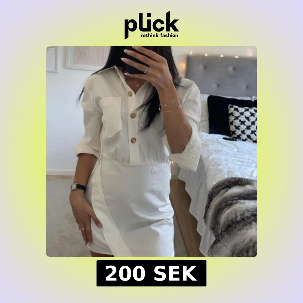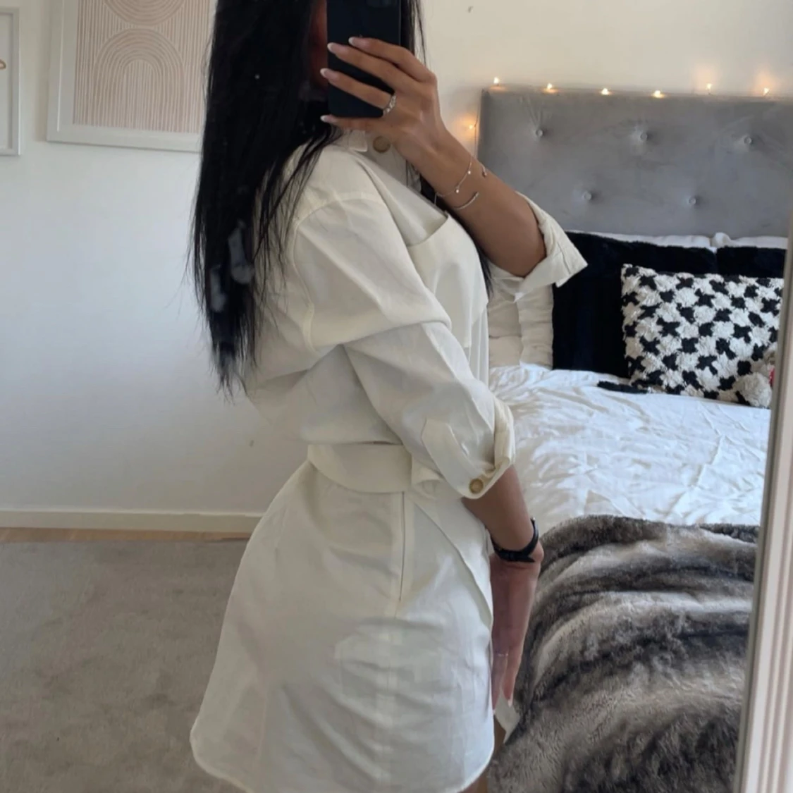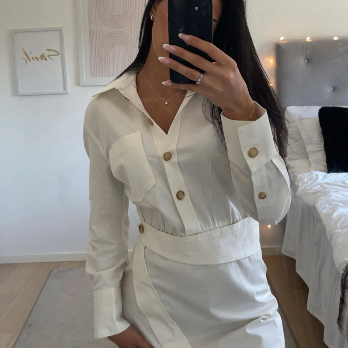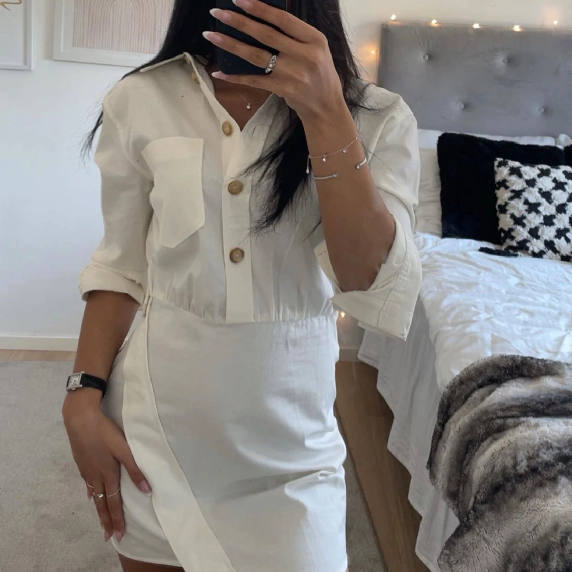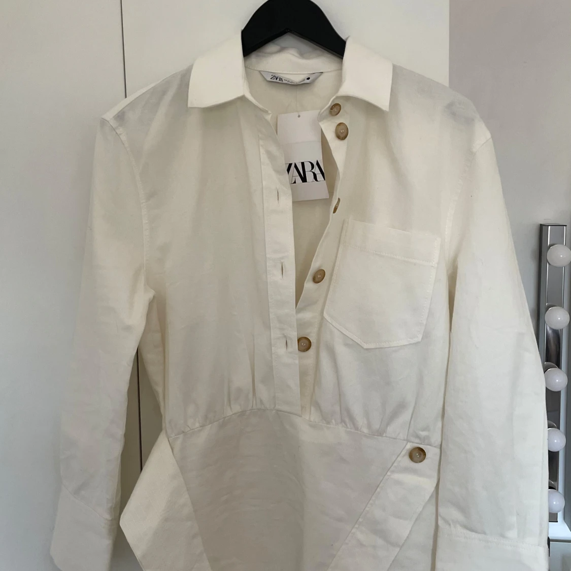Vit skjortklänning från Zara med långa ärmar, krage och dekorativa träknappar framtill. Klänningen har en markerad midja och en bröstficka, samt en asymmetrisk detalj vid kjolen. Helt ny med prislappen kvar