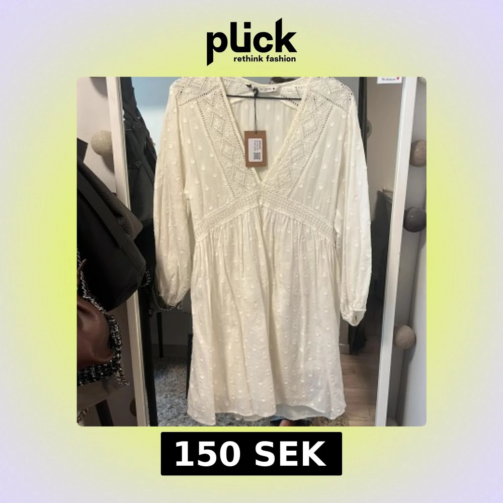 Superfin vit klänning från Zara med v-ringning och spetsdetaljer. Klänningen har långa ärmar och ett diskret broderat mönster. Perfekt för sommarens tillfällen och har en luftig passform.
