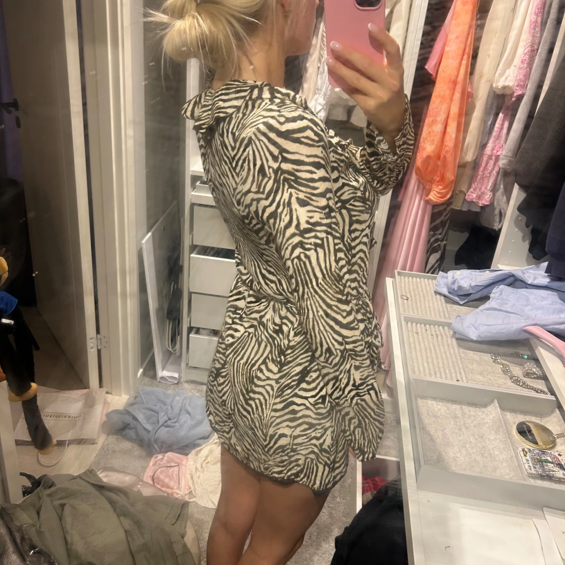Kort zebramönstrad omlottklänning med v-ringning och långa ärmar. Klänningen har svartvita ränder och knyt i midjan för en snygg passform. Perfekt för dig som vill sticka ut med en trendig look.