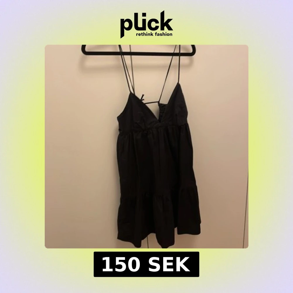 Supersöt svart kort klänning med tunna axelband och v-ringning. Klänningen har volang nertill och knytning i ryggen. Storlek s