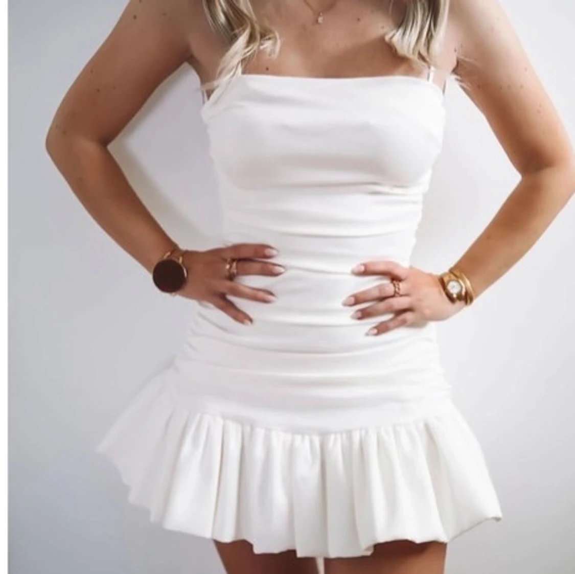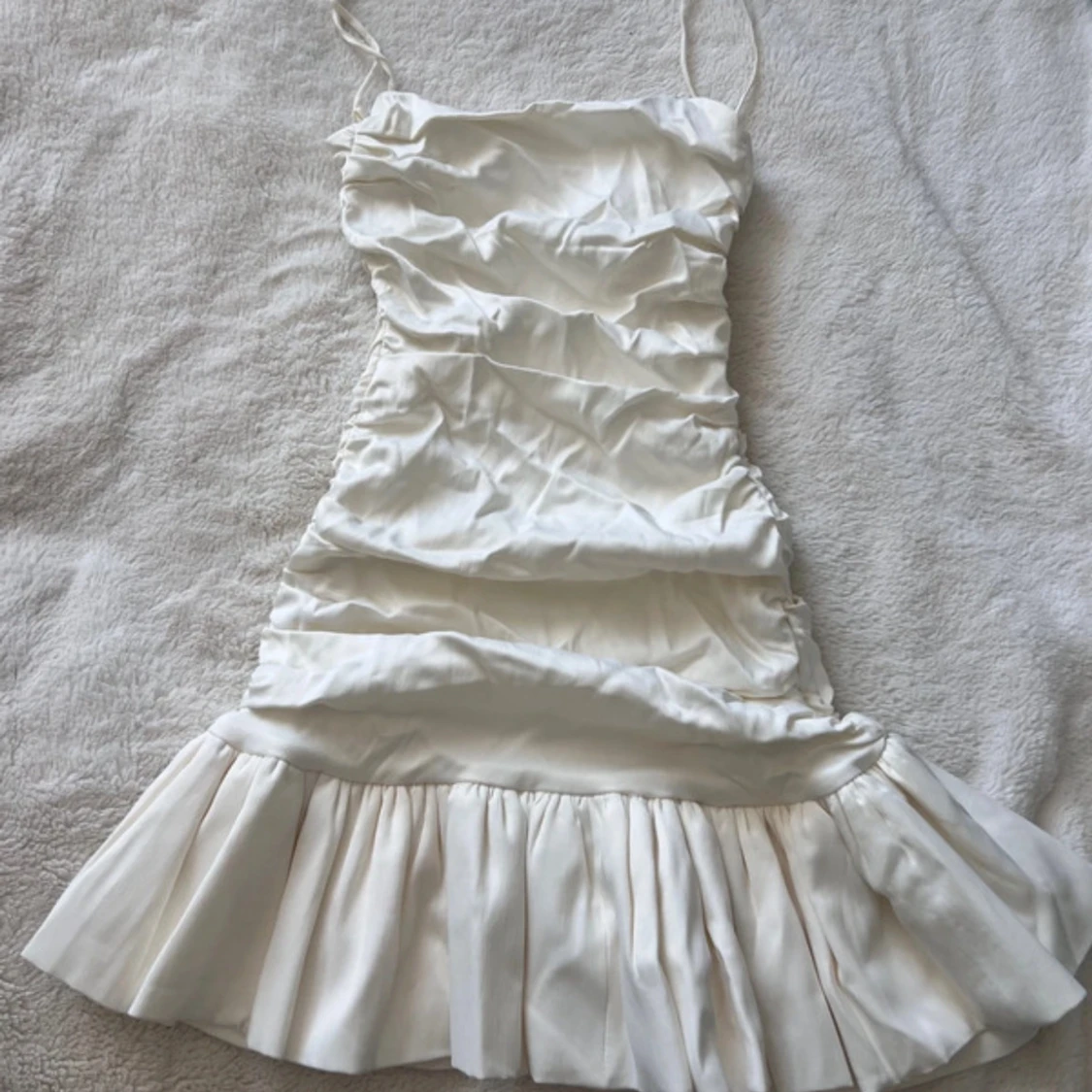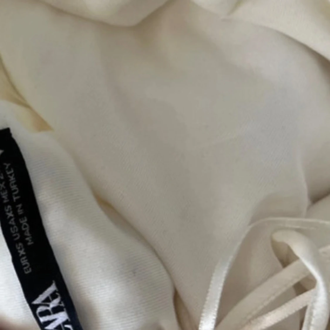 Slutsåld volangklänning från Zara , den är typ väldigt ljusbeige / krämvit , nypris 499kr . Dragkedja på ena sidan. Den är skrynklig men annars bra skick.