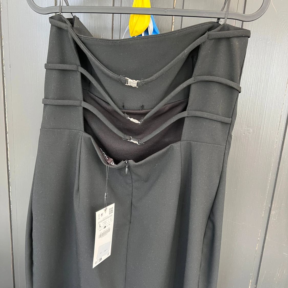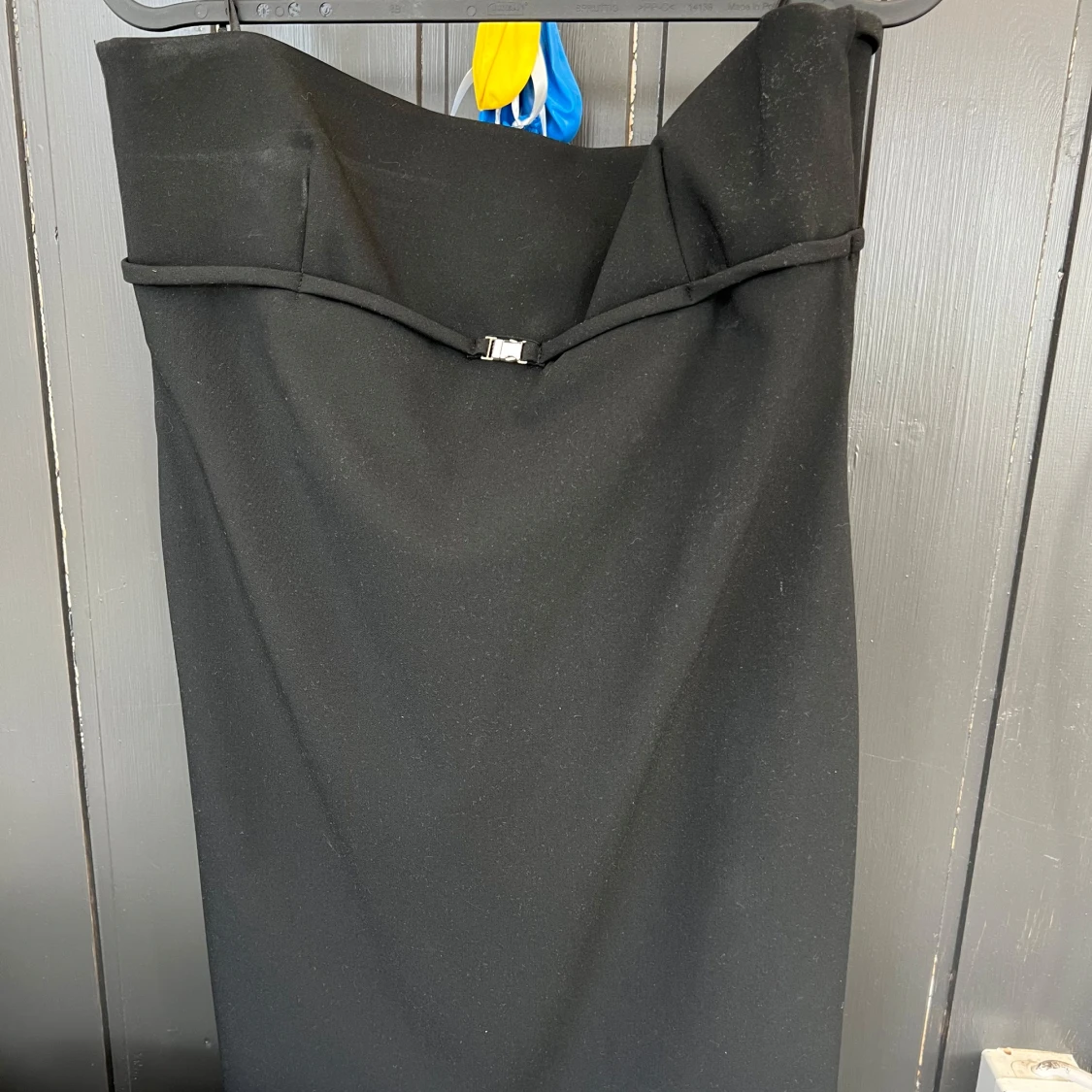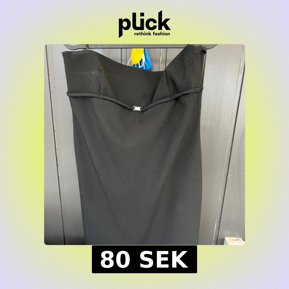 Säljer en svart axelbandslös klänning med liten metall-detalj framtill. Klänningen har en elegant och stilren design, perfekt för dig som gillar minimalistiskt mode. Halvöppen rygg