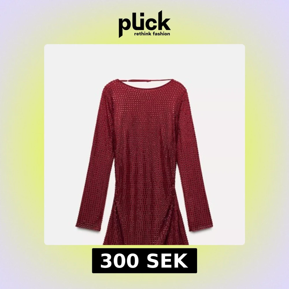 Vinröd kortklänning med långa ärmar och glittriga paljettdetaljer. Djup urringning i ryggen och figurnära passform. Perfekt för festliga tillfällen när du vill sticka ut.