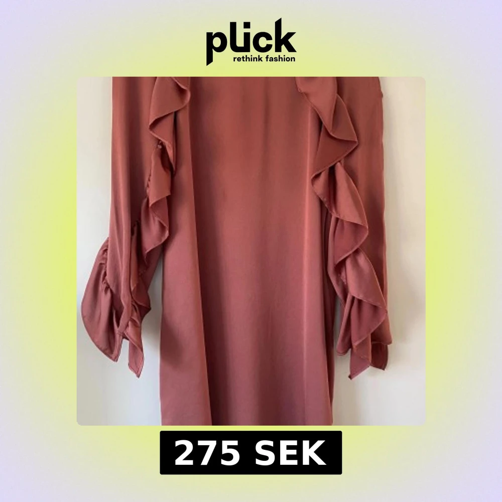 Supersöt rosa klänning med långa volangärmar och rak passform. Klänningen har en mjuk, flowy känsla och är perfekt för dig som gillar en feminin och trendig look. Ärmarna har flera lager volanger som ger extra rörelse och stil. Använd ett par gånger.