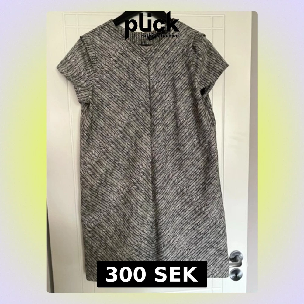 Säljer en snygg kortärmad klänning från Zara Basic Collection. Klänningen är vit med svart mönster som liknar små blad eller fjädrar och har en rak, enkel form. Perfekt för dig som gillar stilrena och grafiska plagg.