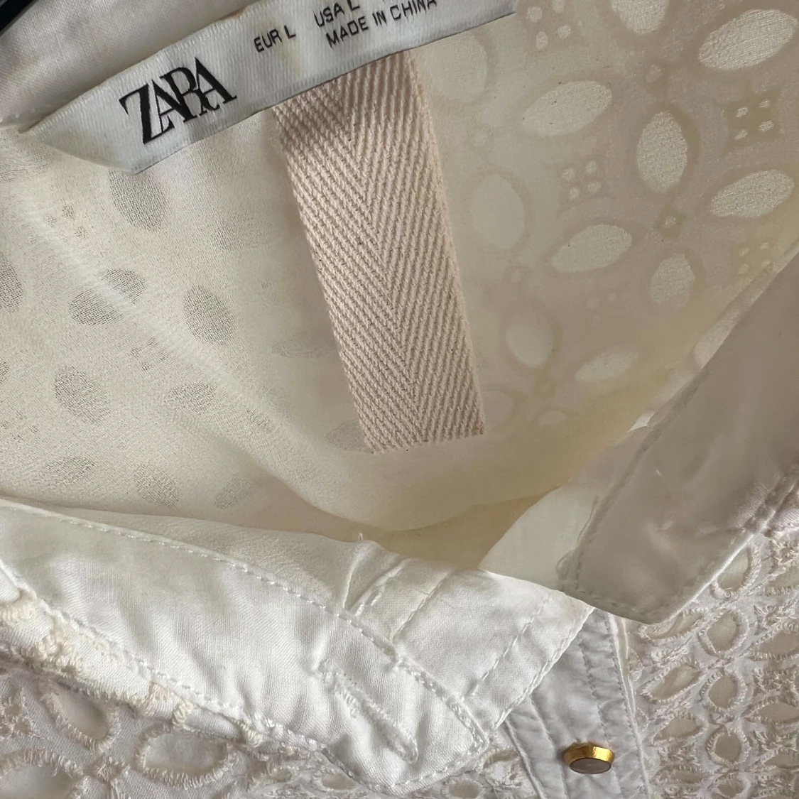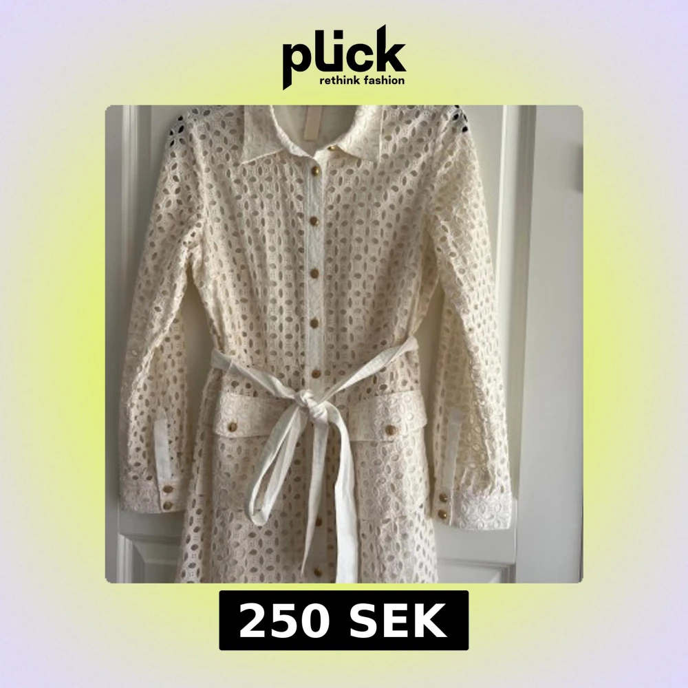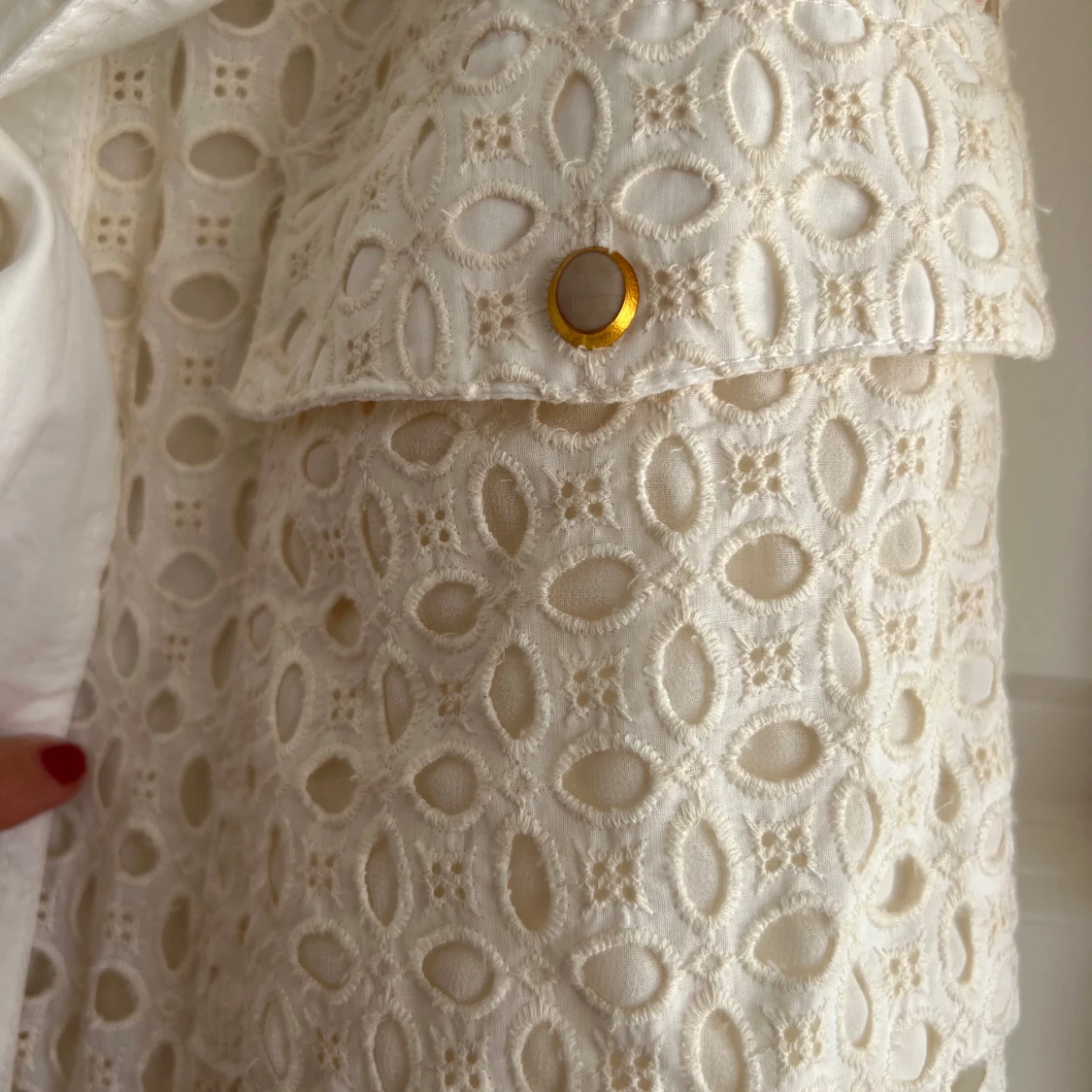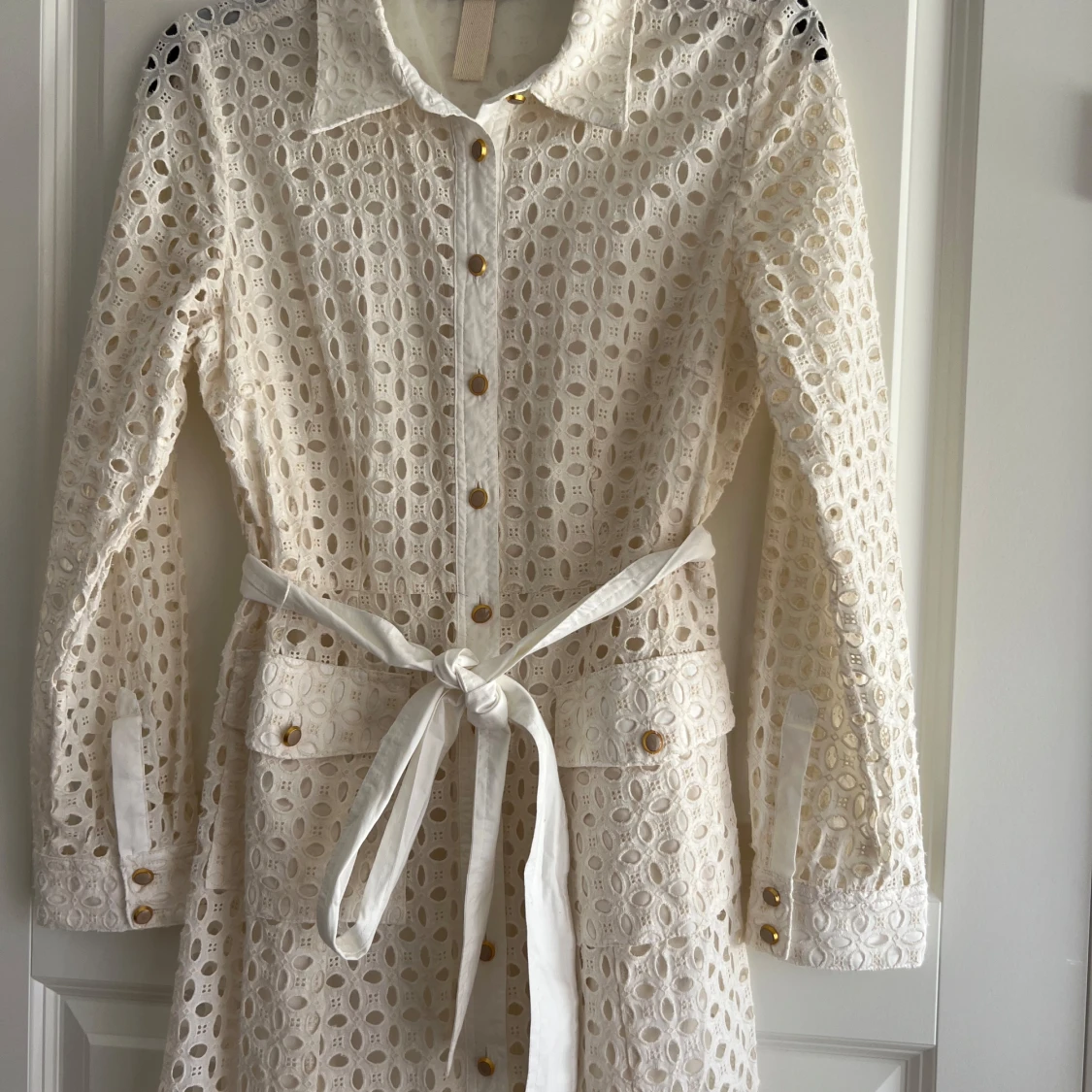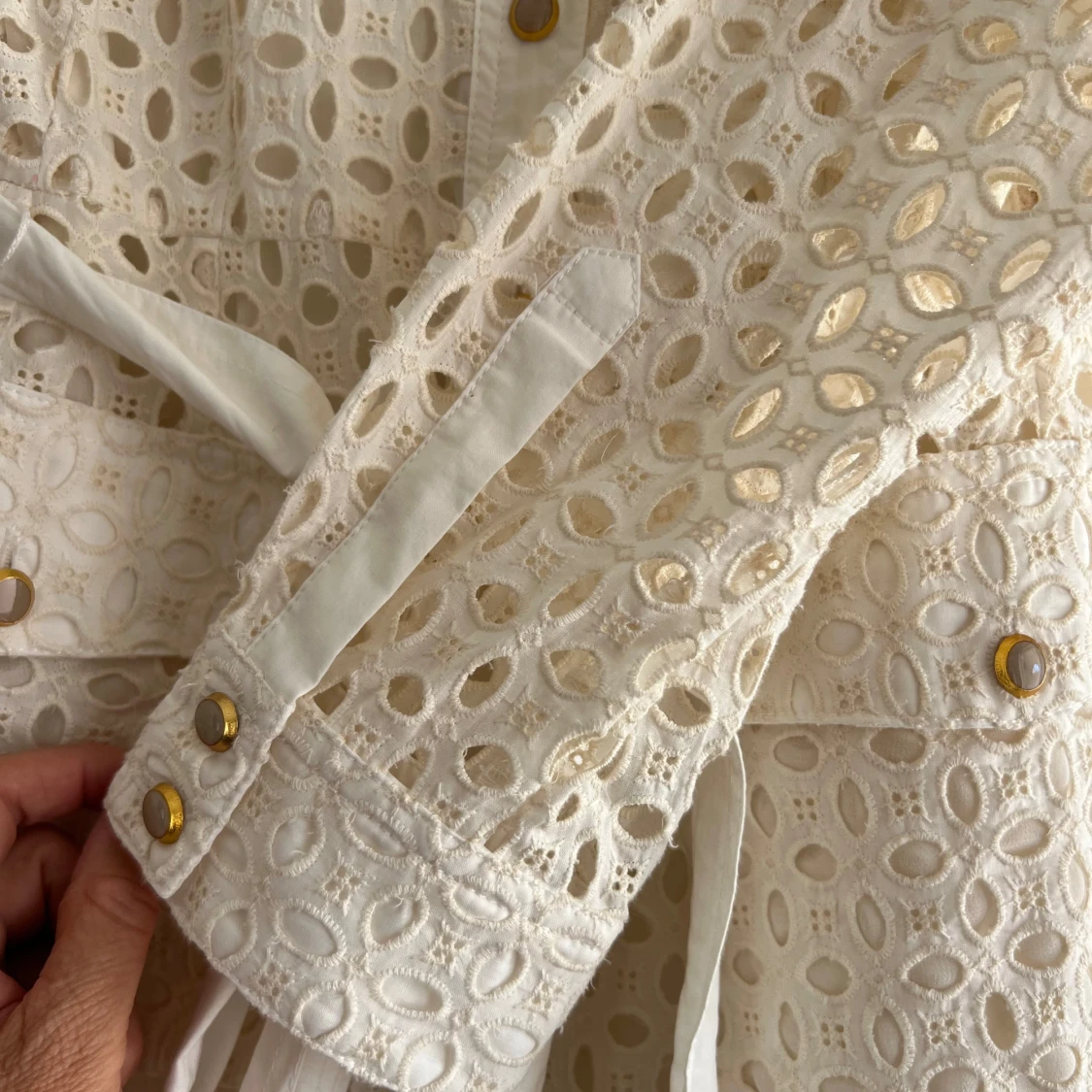 Superfin vit spetsklänning från Zara med lång ärm, snygga guldknappar och knytbälte i midjan. Klänningen har ett genombrutet broderat mönster och stora fickor framtill. Perfekt för dig som gillar romantisk och trendig stil.