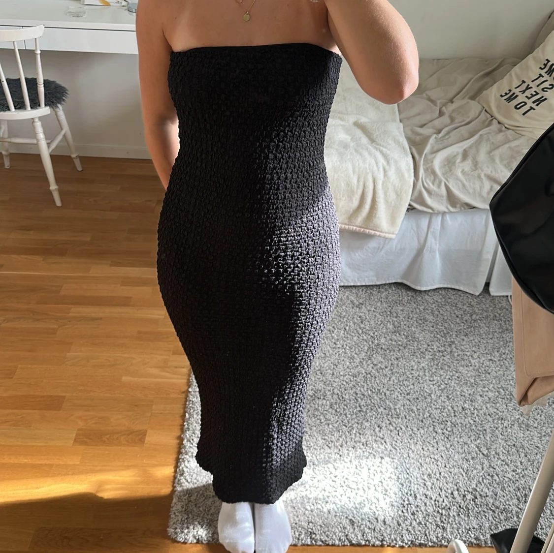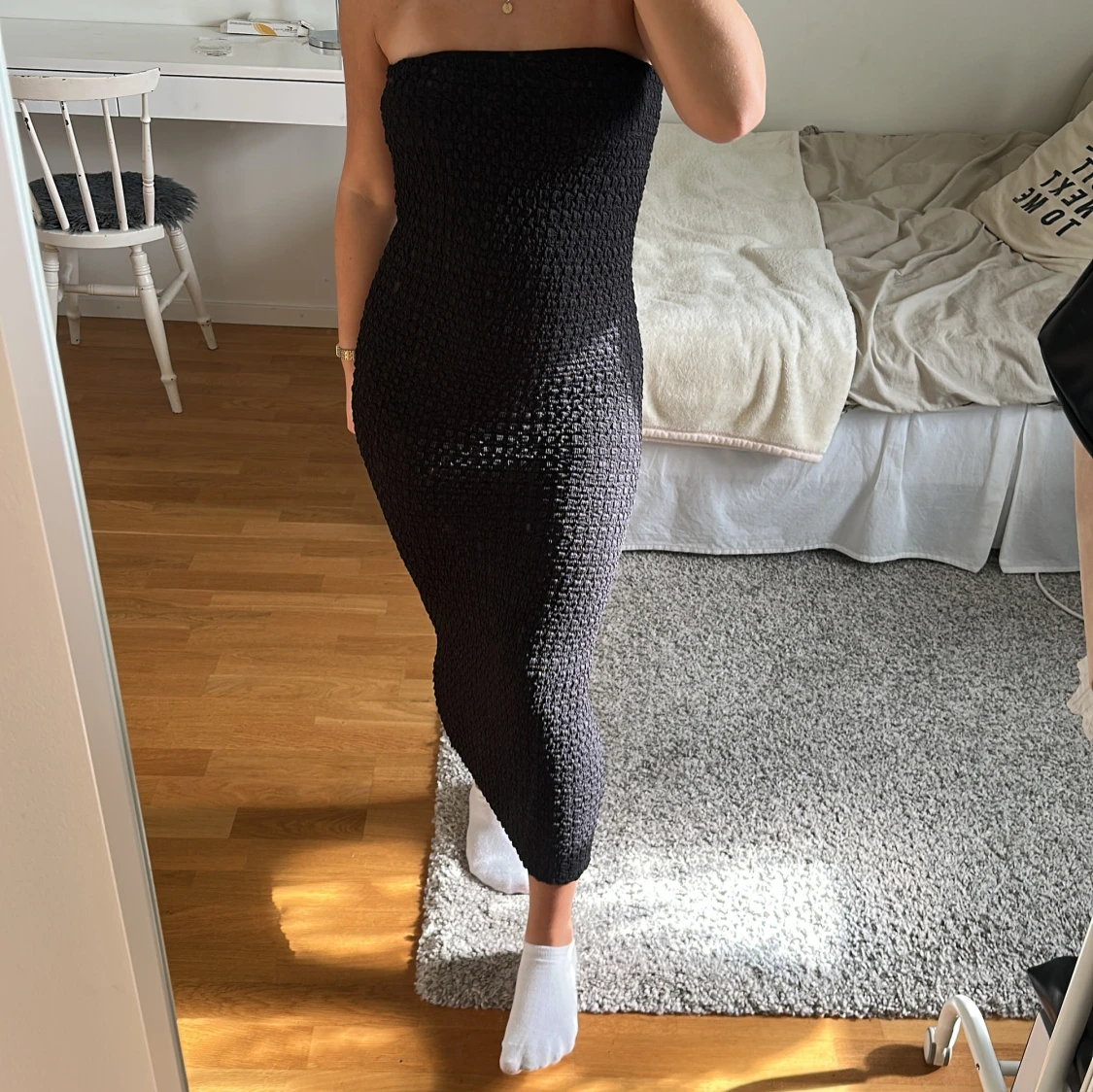 Säljer denna svarta tubklänning med figurnära passform och lång längd. Klänningen är ärmlös och har en stretchig struktur som formar sig snyggt efter kroppen. Perfekt för dig som gillar minimalistisk och stilren look 💓