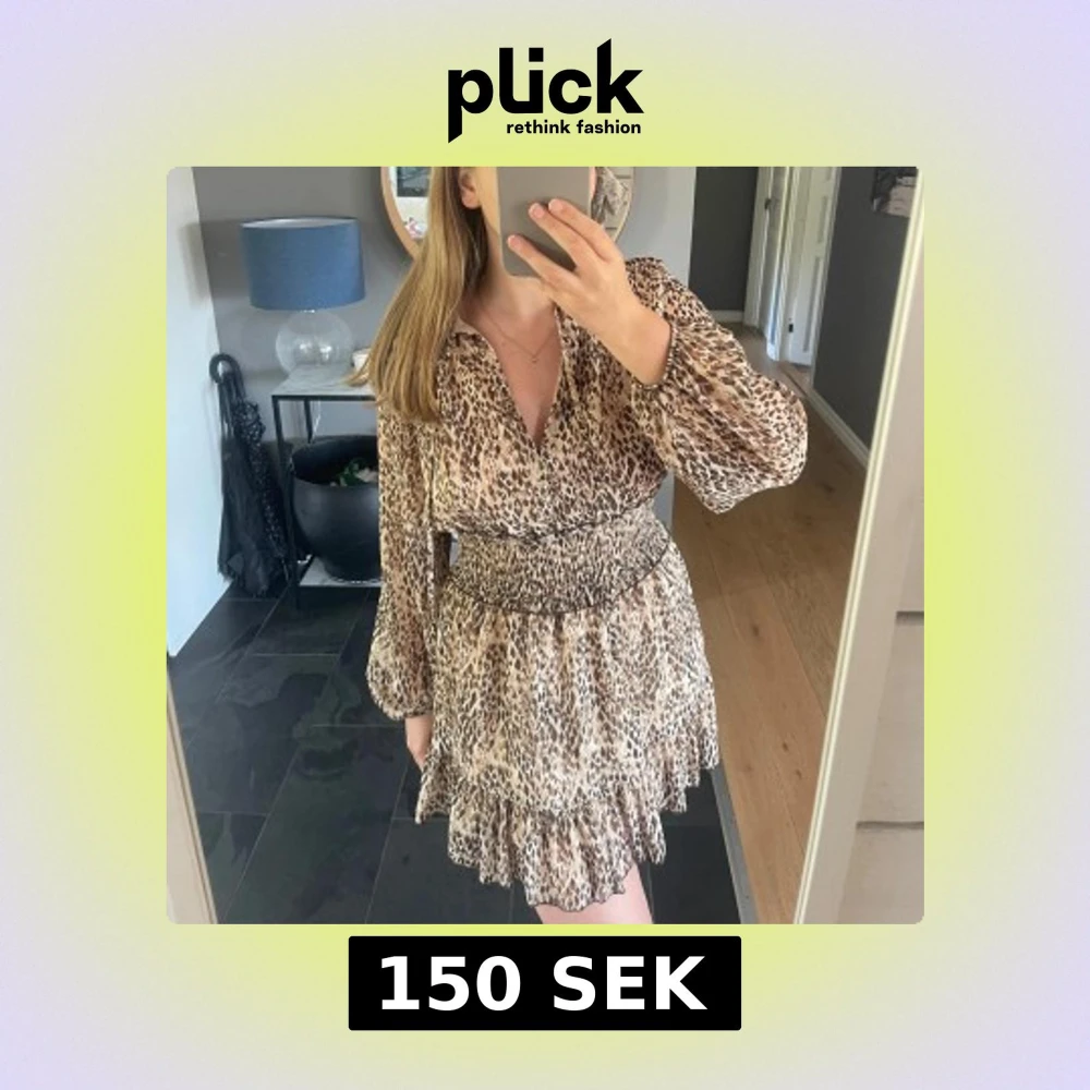 Säljer en snygg leopardmönstrad klänning från Zara med långa ärmar och smockad midja. Klänningen har v-ringning och volangdetaljer nertill, vilket ger en trendig och feminin look. Perfekt för dig som vill sticka ut!