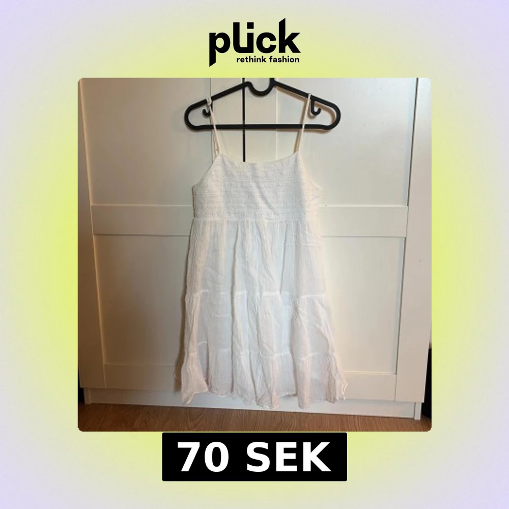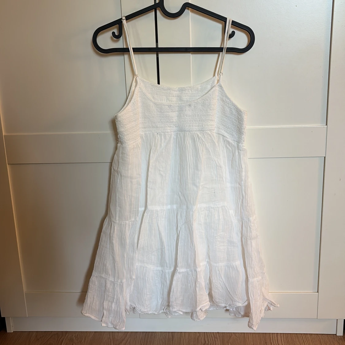 Luftig vit klänning med smala axelband och rynkad överdel.