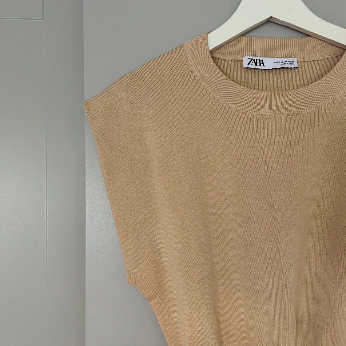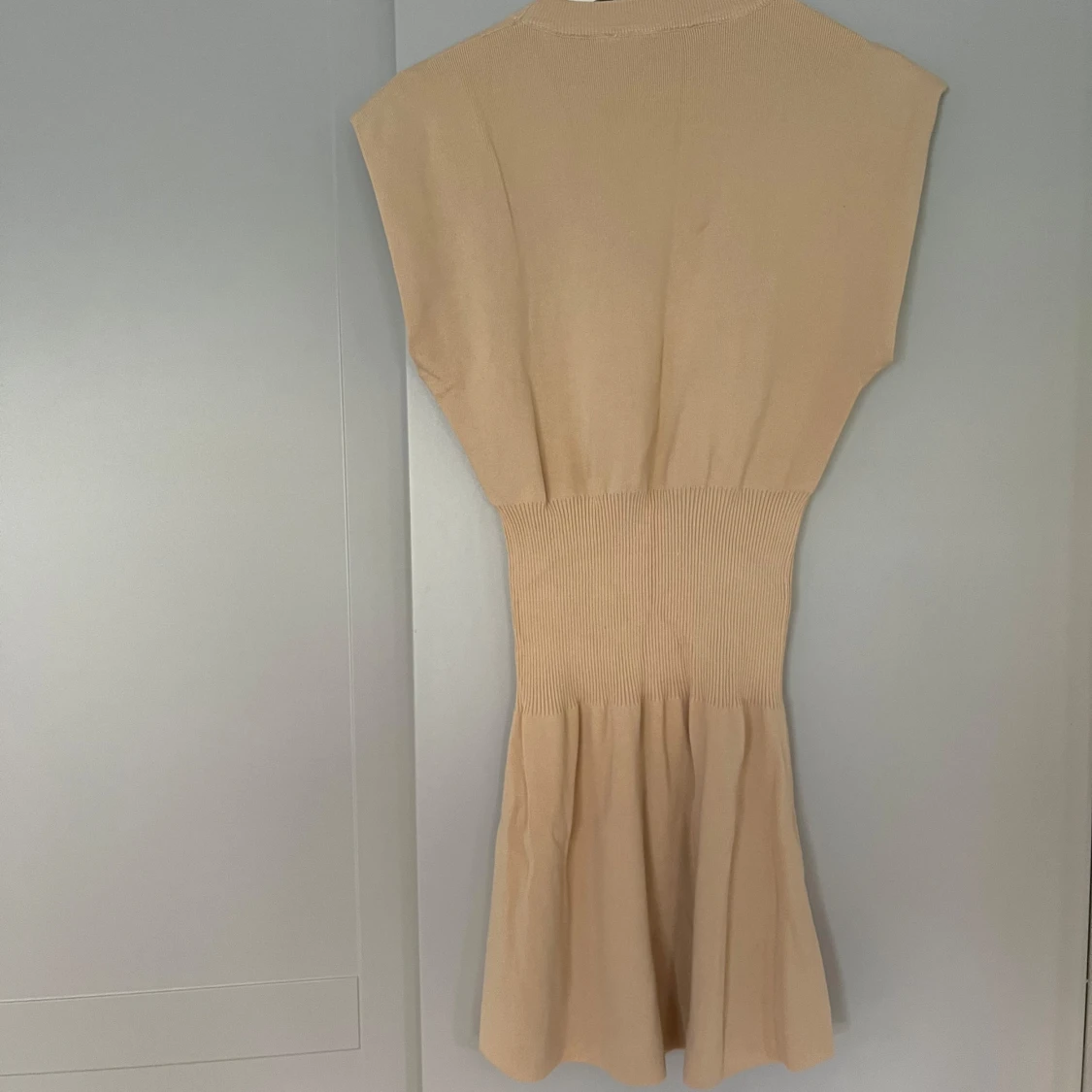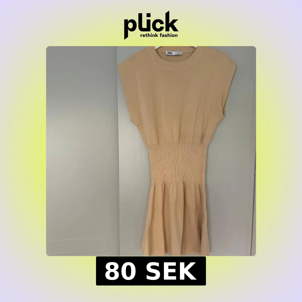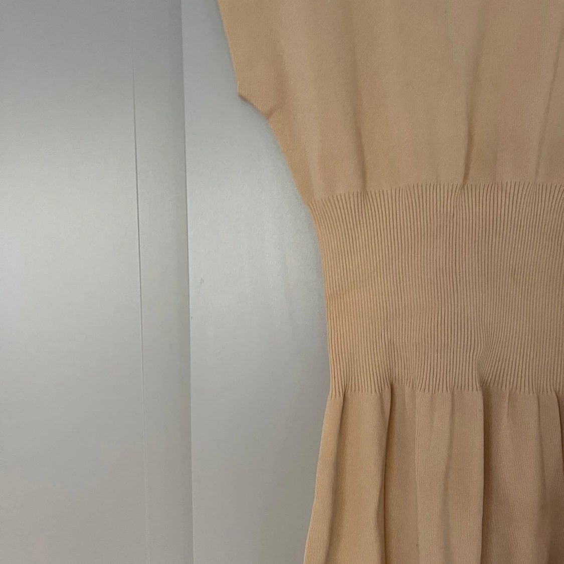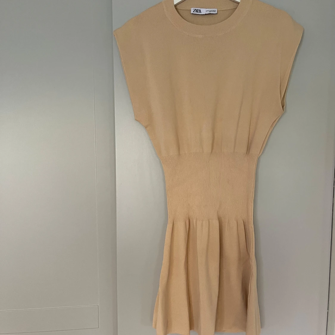 Supersnygg beige stickad klänning från Zara med rund hals och korta ärmar. Modellen har ribbad midja som ger en markerad siluett och ett lätt utställt kjolparti. Perfekt för dig som gillar enkel och stilren design med en mjuk känsla.