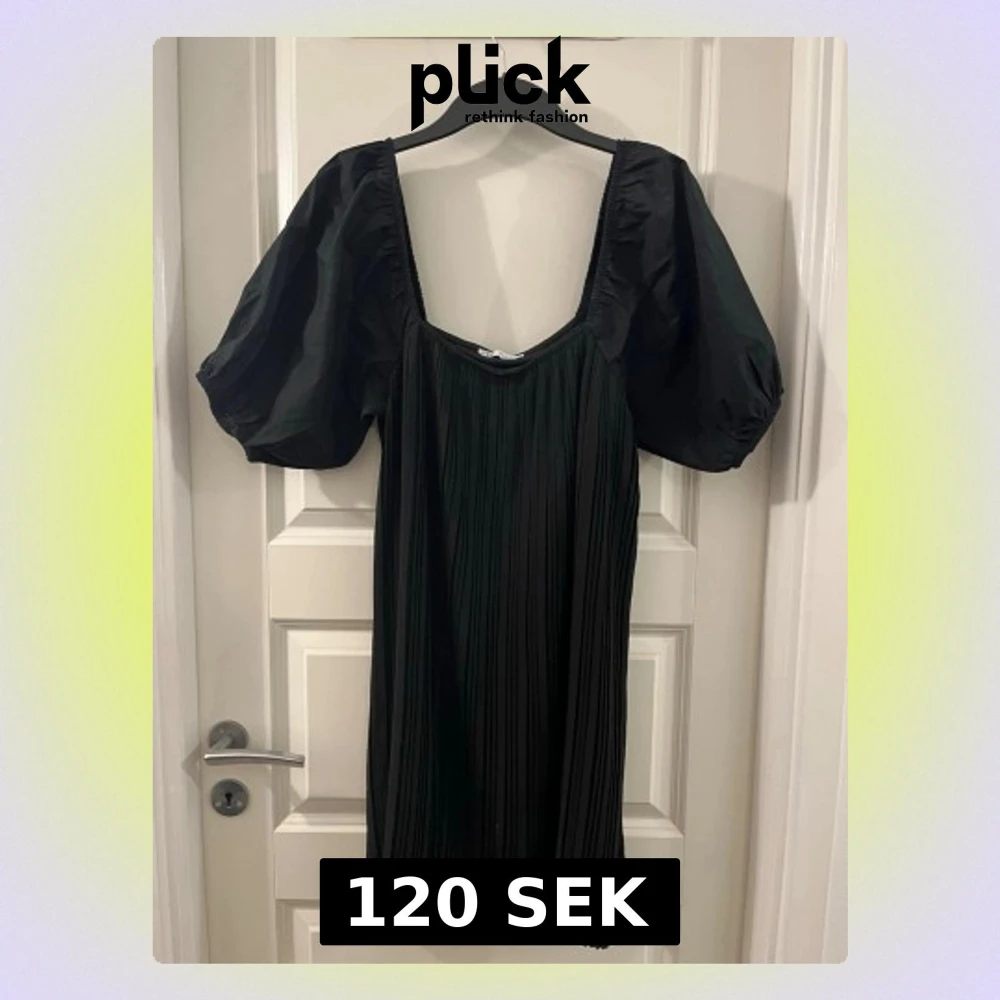 Supersnygg svart klänning från Zara med puffiga korta ärmar och plisserad kjol. Klänningen har en fyrkantig ringning och luftig passform som ger en trendig siluett. Perfekt för dig som gillar stilrena och moderna plagg.