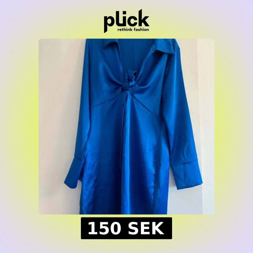 Snygg blå klänning från Zara i satinliknande material. Klänningen har lång ärm, krage och en cool knytning framtill vid bysten. Perfekt för dig som vill sticka ut med en färgstark look. Rak passform och knappar framtill.