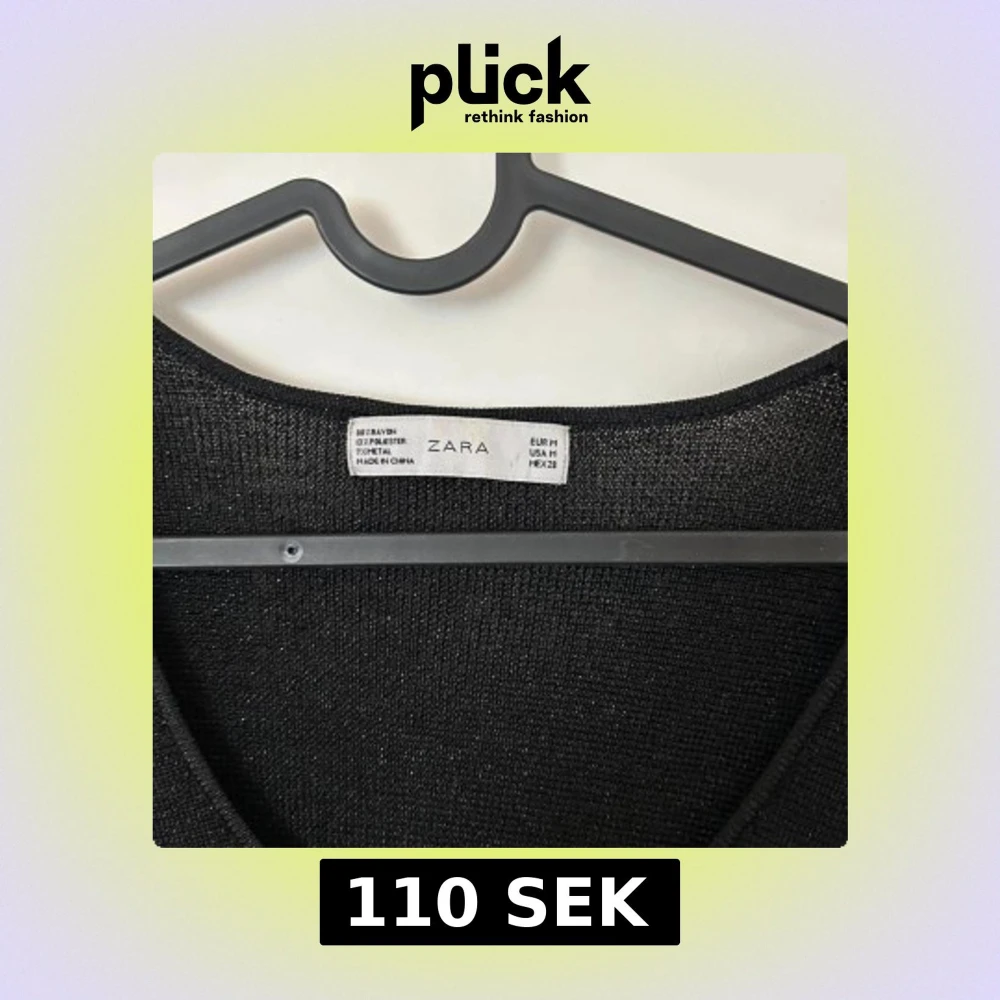 Supersnygg svart klänning från Zara med glittrig finish. Klänningen har lång ärm, rundad urringning och ett lätt utställt kjolparti. Materialet är en mix av polyester och metalltråd som ger en skimrande look. Perfekt för dig som vill sticka ut lite extra.