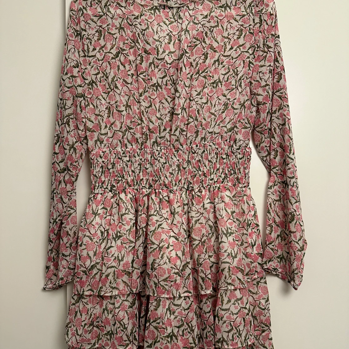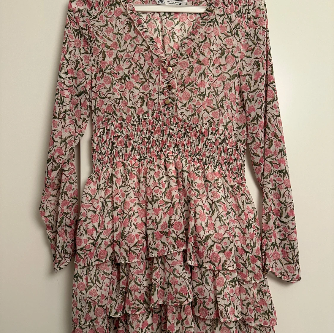Superfin blommig klänning från Zara i rosa och grönt. Den har långa ärmar och en smockad midja som ger en snygg passform. Volangerna ger en extra touch av stil och rörelse. Perfekt för vår och sommar! 🌸