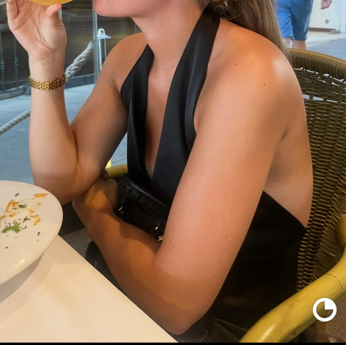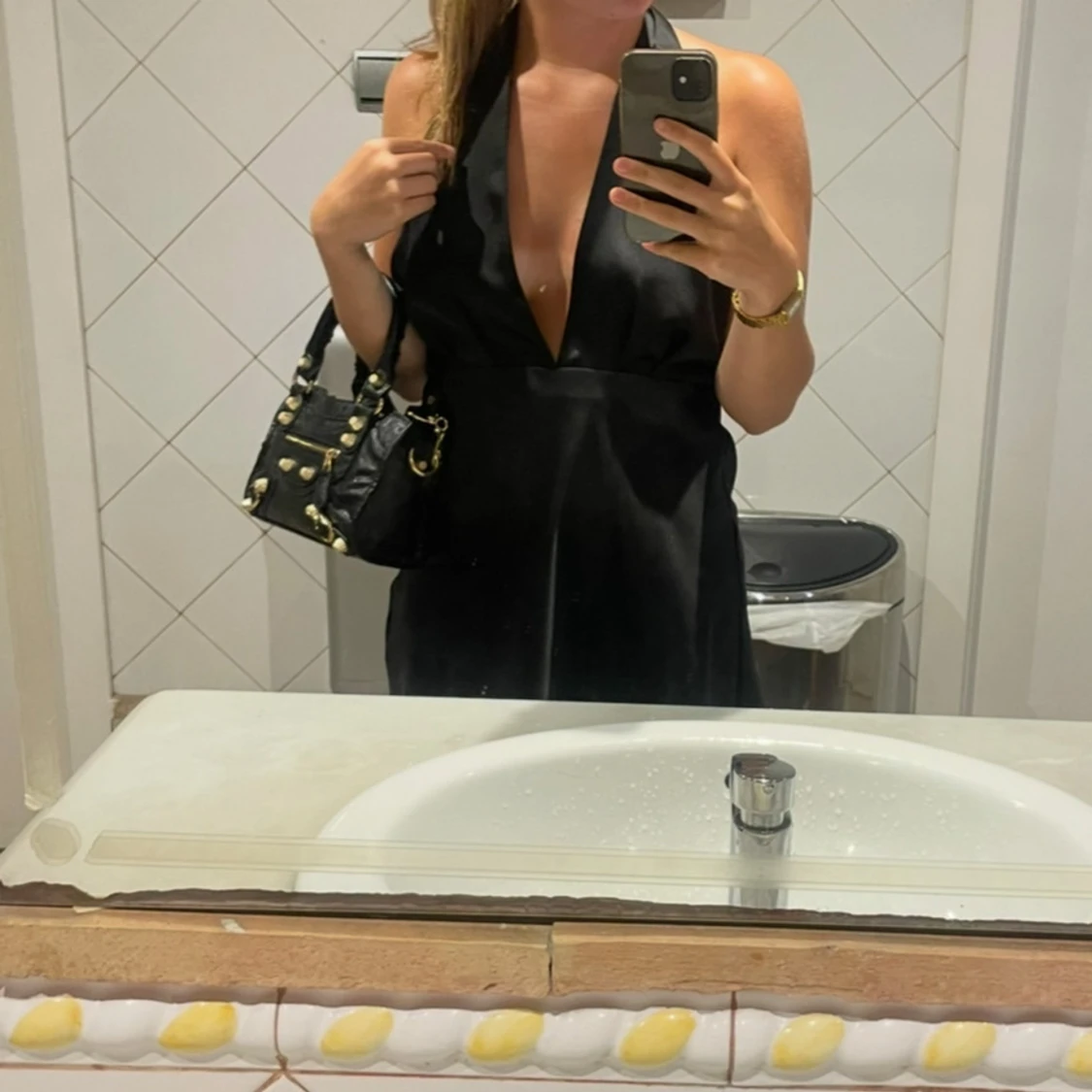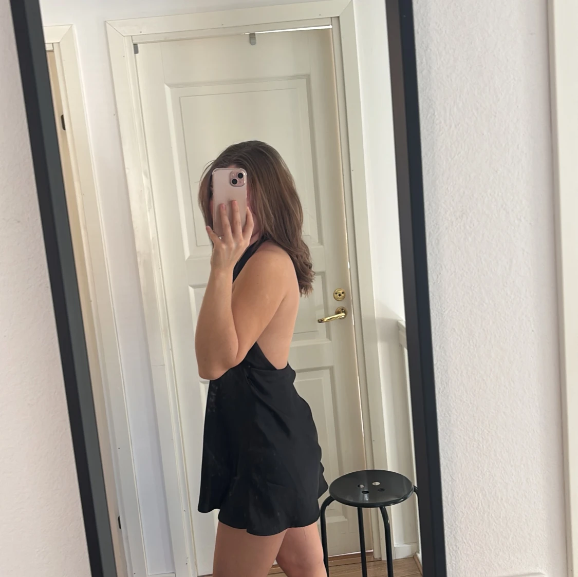 Snygg svart kortklänning med djup v-ringad urringning och öppen rygg. Perfekt för en utekväll eller fest. Klänningen har en elegant passform och knyts i nacken.