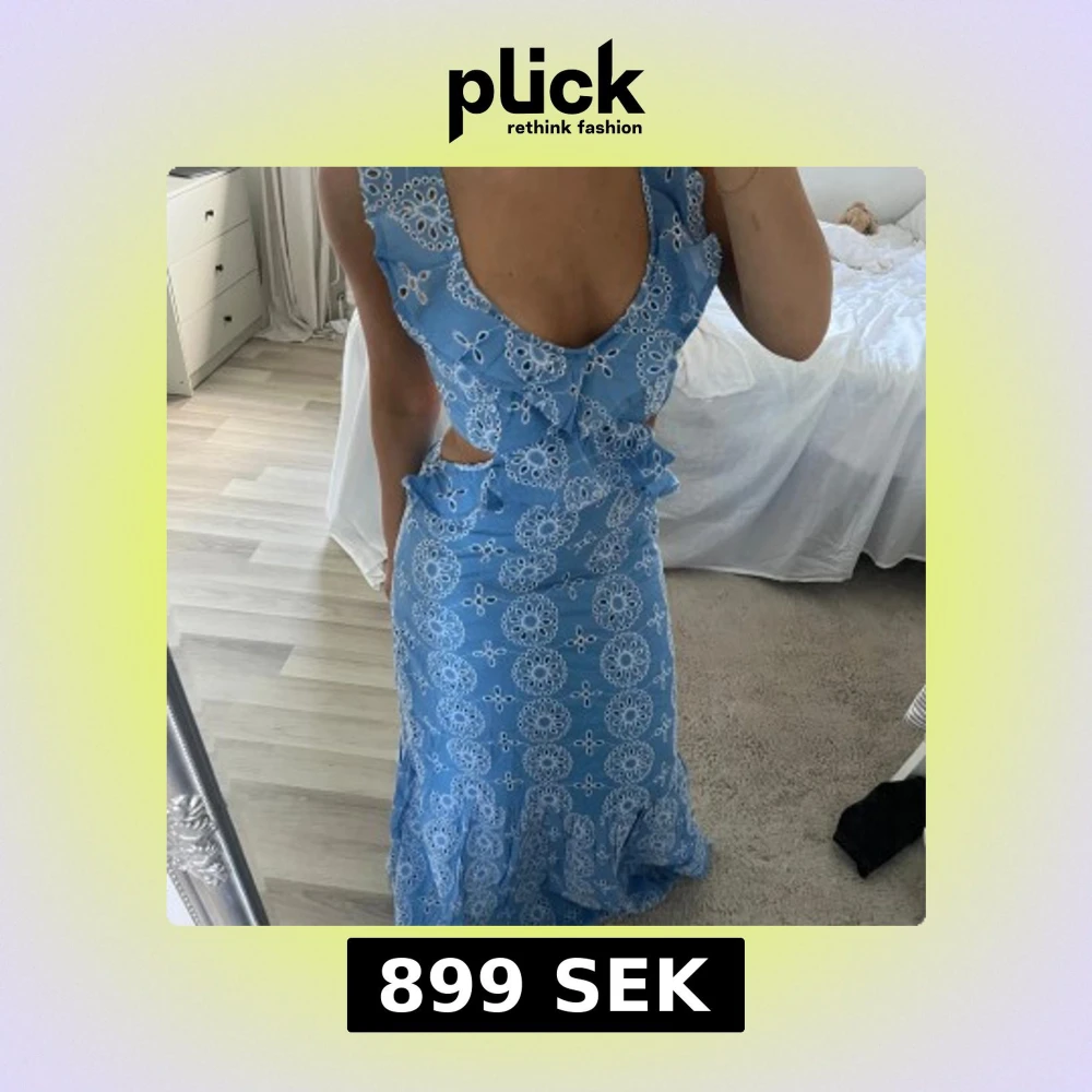 Supersöt blå långklänning med vita broderade blommor, volangdetaljer och cut-outs i midjan. Köpt på mango för 1000kr, helt slutsåld.