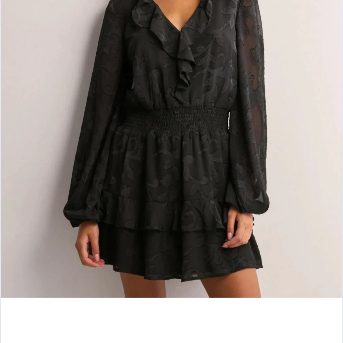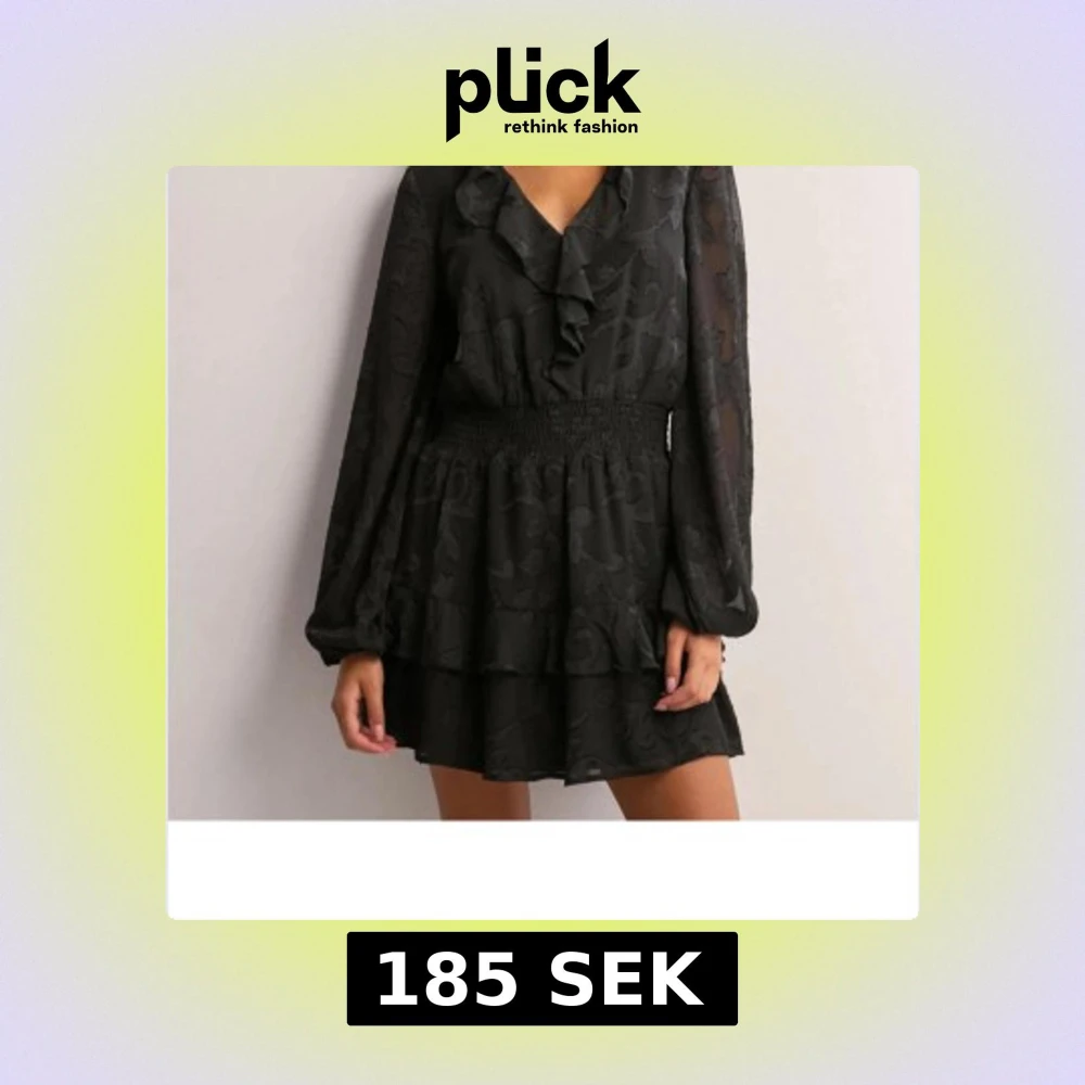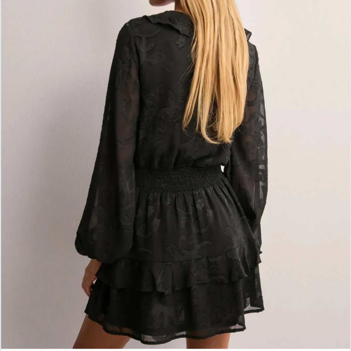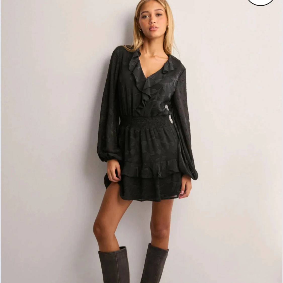 Snygg svart kortklänning med volangdetaljer och v-ringning. Klänningen har långa, lätt transparenta ärmar och smock i midjan för en bekväm passform. Tunt, mönstrat tyg som ger en elegant känsla. Prislapp finns kvar