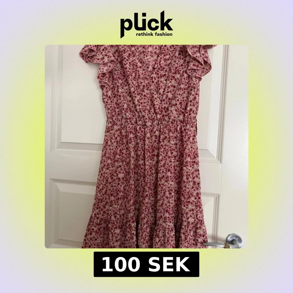 Supersöt kortklänning med rödblommigt mönster och volangärmar. Klänningen har omlott-look upptill, markerad midja och volangdetaljer nertill. Perfekt för sommarens alla tillfällen. Lätt och luftig känsla.