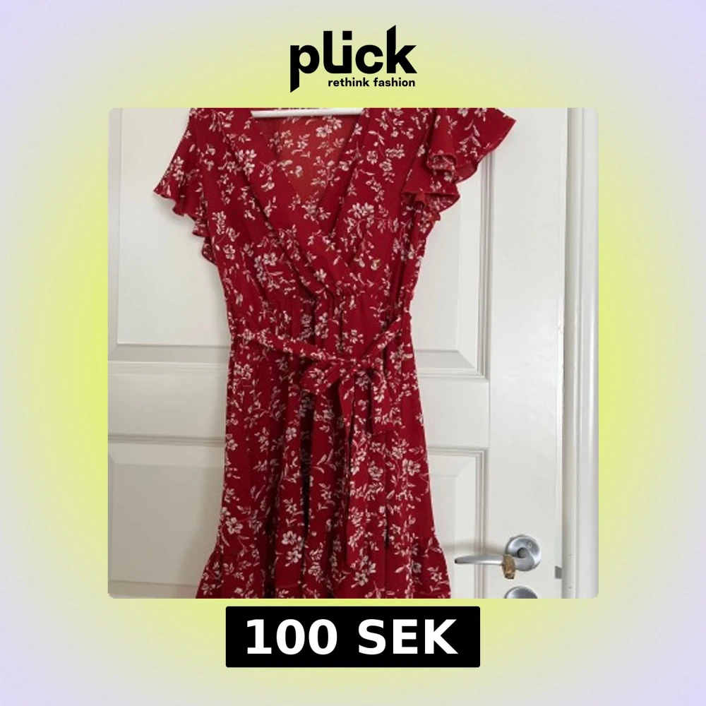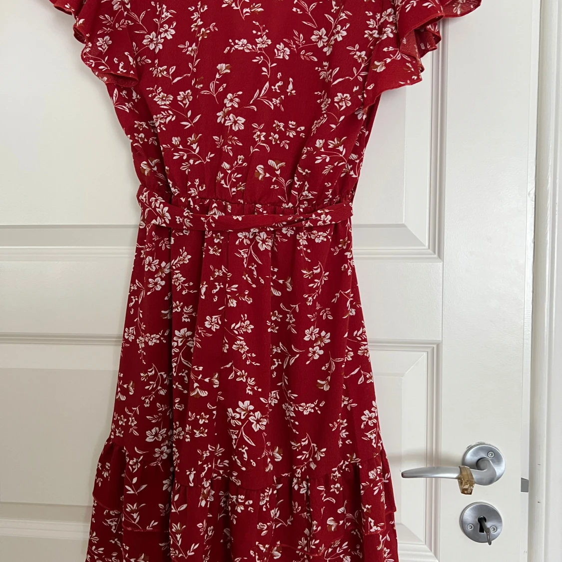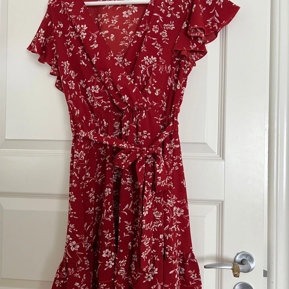 Supersöt röd kortklänning med vitt blommönster, omlottmodell och volangdetaljer på ärmarna. Klänningen har knytband i midjan och v-ringning. Perfekt för sommarens alla tillfällen!