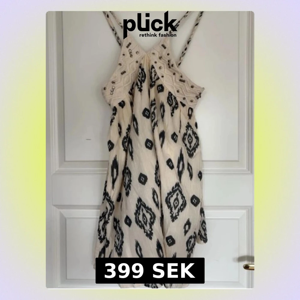 Säljer en ljus kortklänning med svart mönster och tunna axelband. Klänningen har dekorativa pärlor upptill och ett boho-inspirerat mönster. Materialet känns som bomull och den har en avslappnad passform, perfekt för sommardagar.