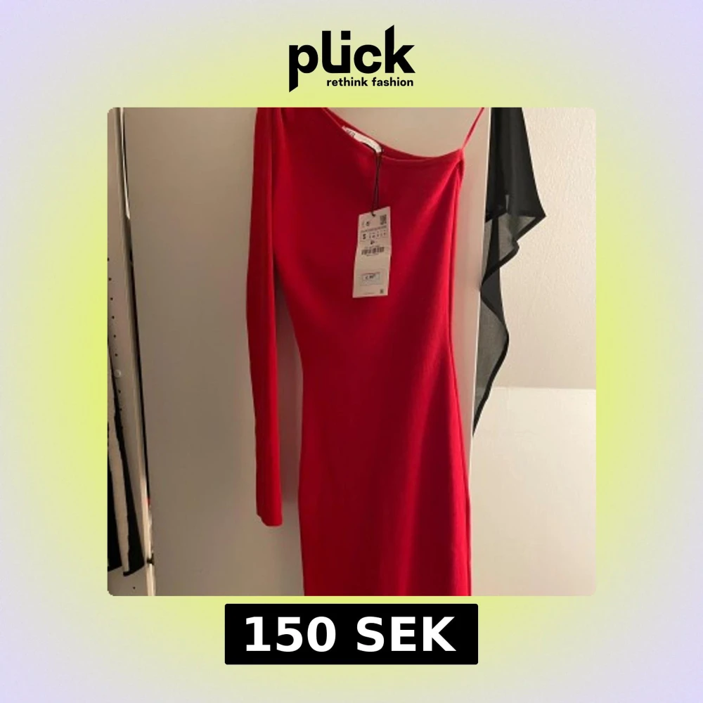 Säljer en röd oneshoulder klänning från Zara i ribbad polyester. Klänningen har lång ärm på ena sidan och en modell som sitter tight och framhäver figuren.