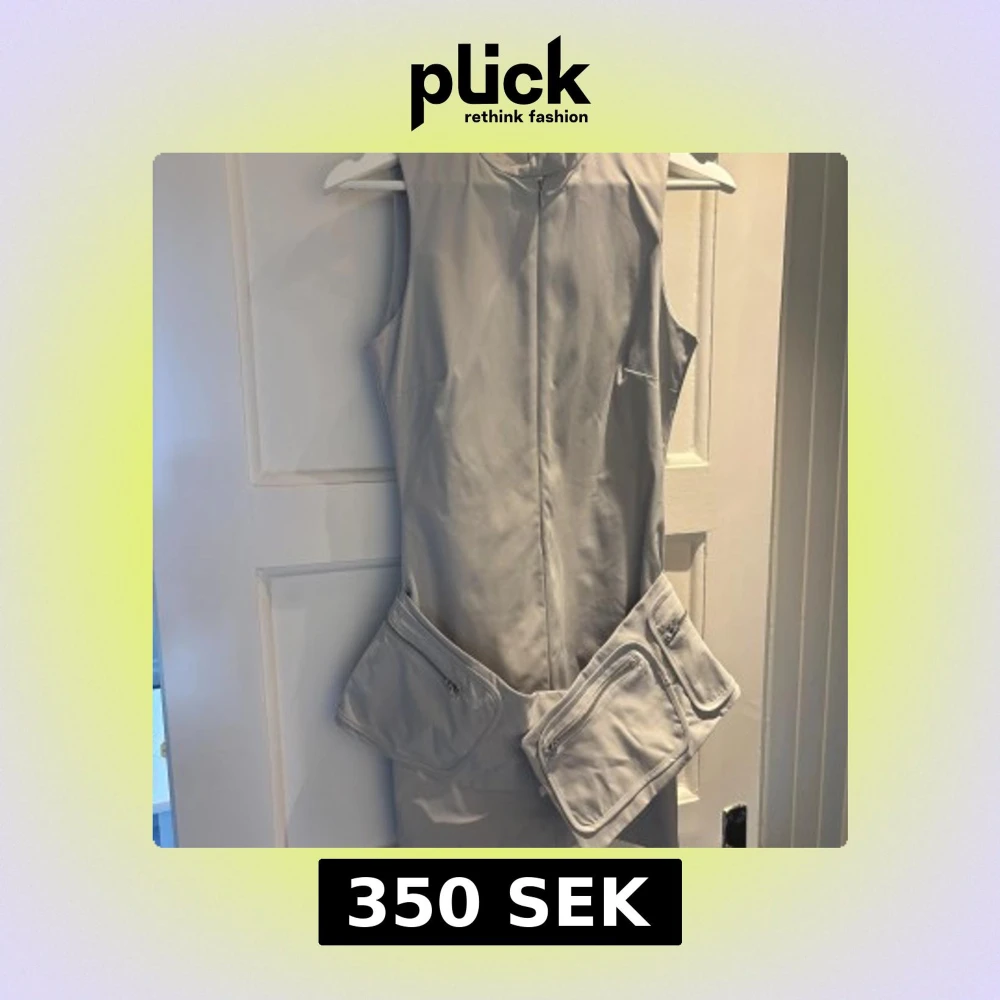 Säljer en stilren ljusgrå ärmlös klänning från Zara med hög krage och dragkedja framtill. Klänningen har två stora fickor med dragkedjor vid höften som ger en cool och modern look.