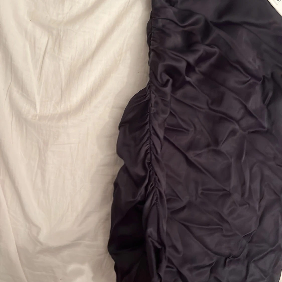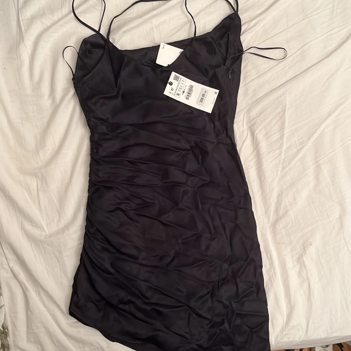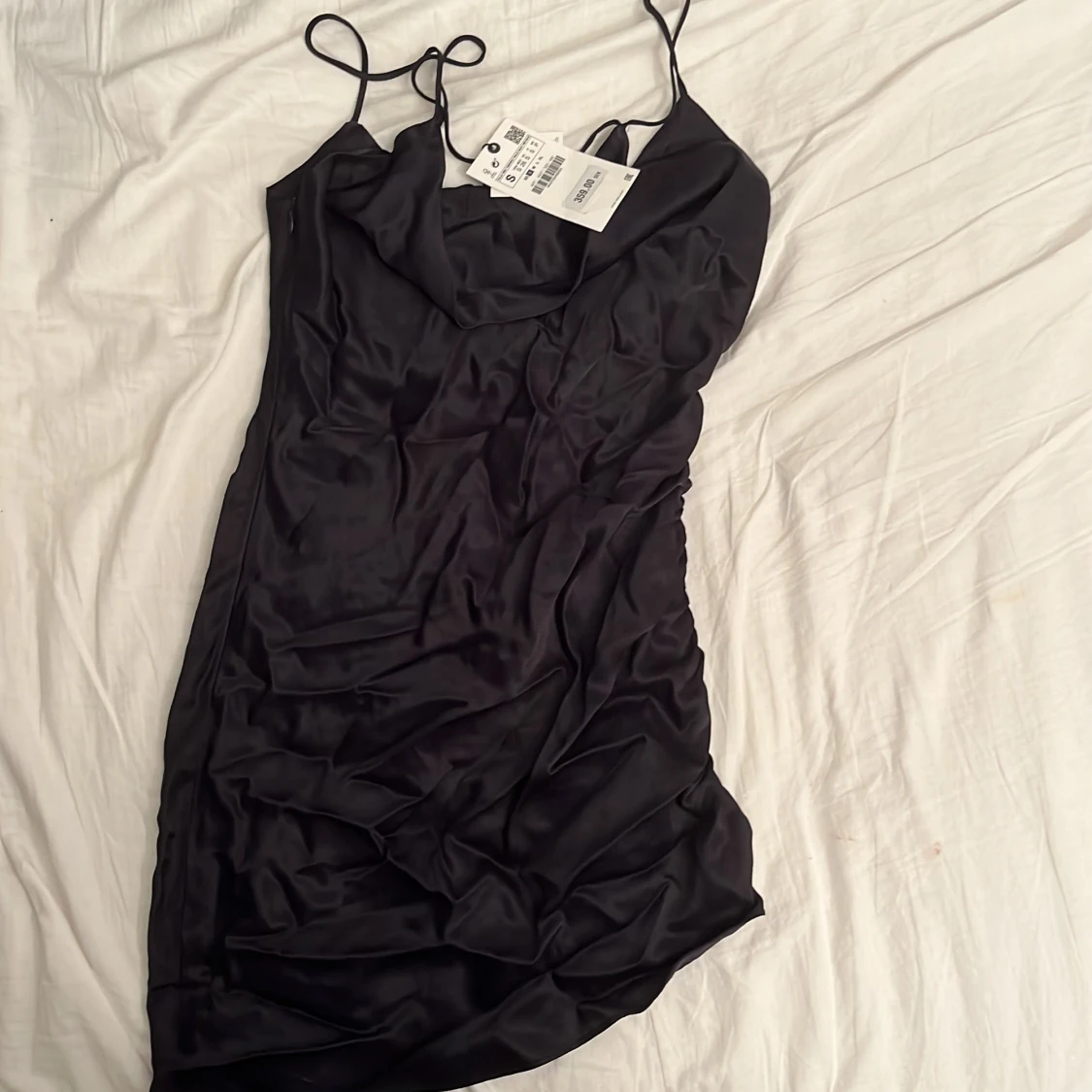 Svart silkes klänning från Zara helt oanvänd med lapp kvar! (org. pris 359kr) Är skrynklig då jag haft den i förvaring, men en av sidorna är sydd i designen så att den ska va lite snyggt skrynkligt och lite ossymetrisk!🫶
