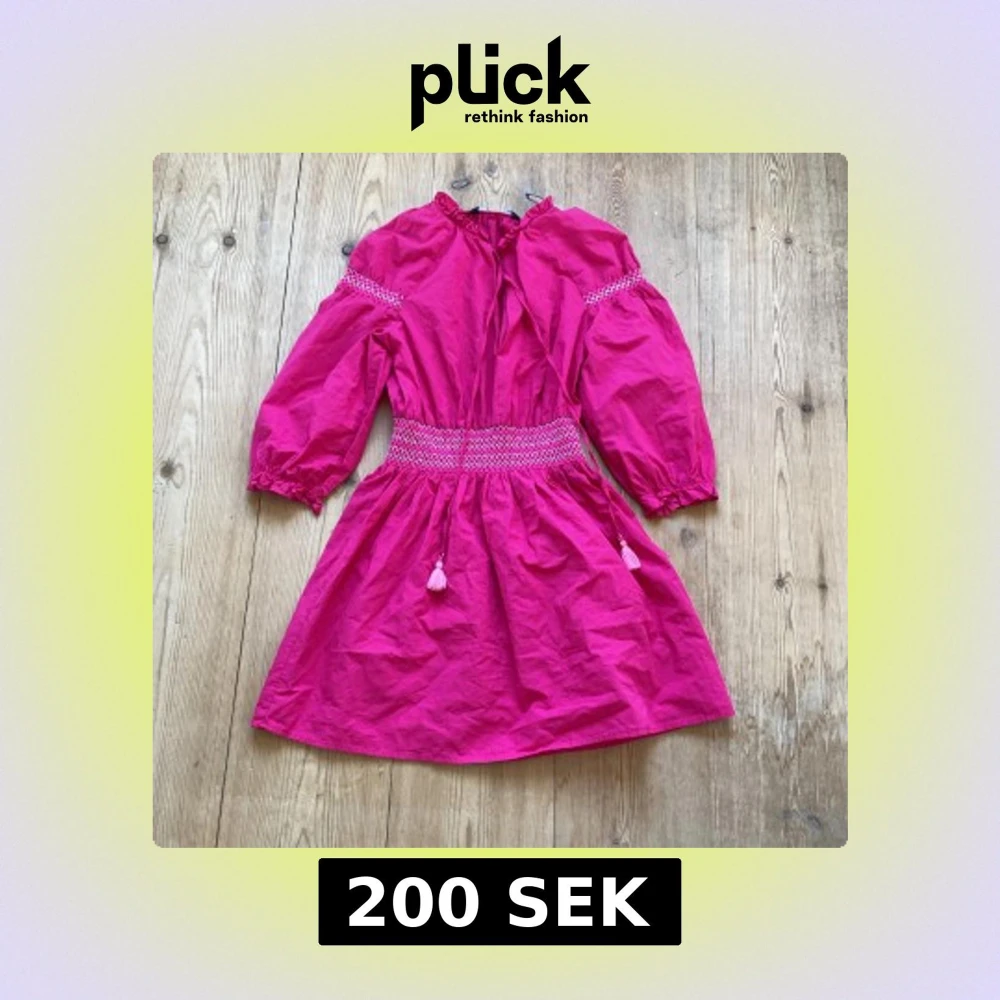 Snygg rosa klänning från Zara med smock i midjan och på ärmarna. Modellen har trekvartsärmar, volang vid halsen och knytband med tofsar.