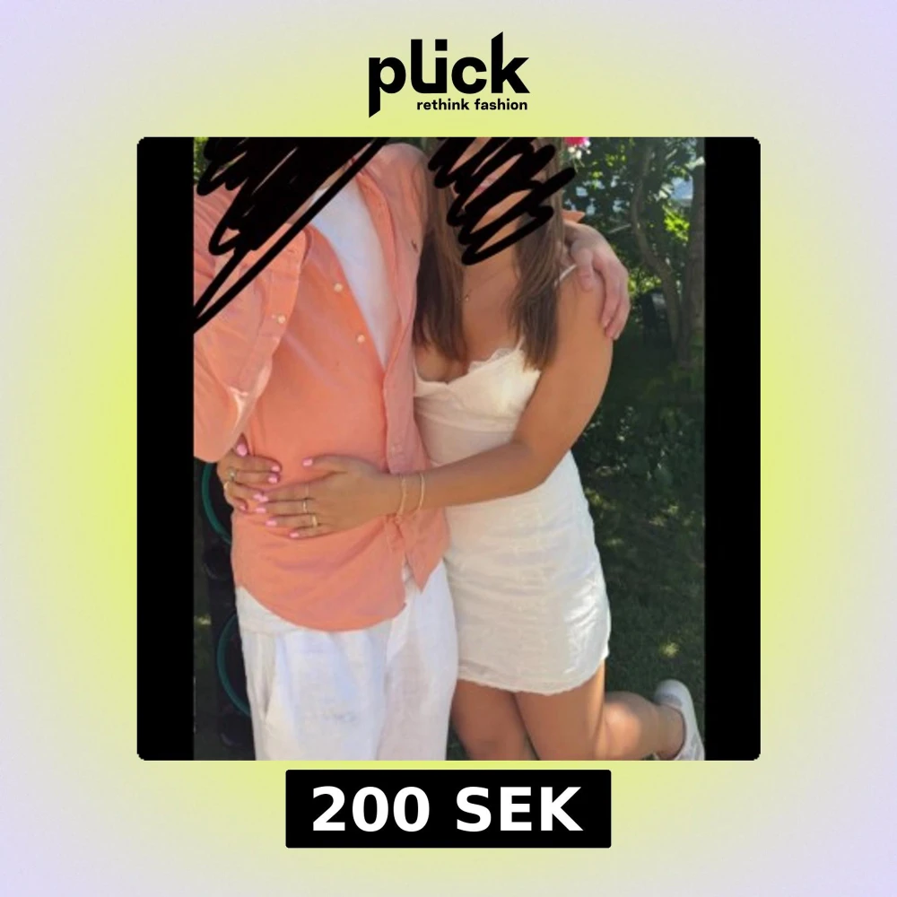 Säljer en söt vit kortklänning med smala axelband och spetsdetaljer upptill. Använd en gång!
