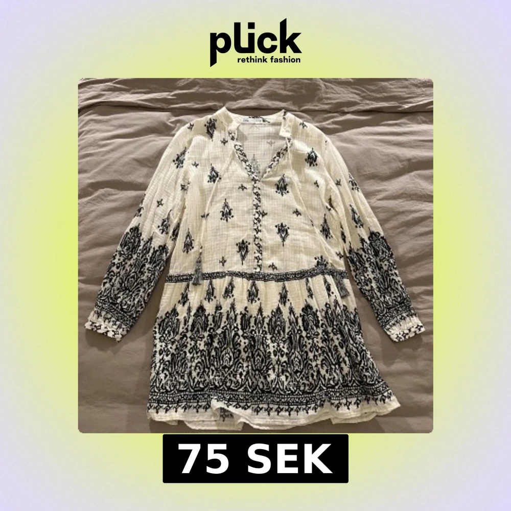 Supersöt kortklänning från Zara i vitt med svart broderat mönster. Klänningen har långa ärmar, v-ringning med knyt och volang nedtill. Perfekt för sommarens alla tillfällen och ger en bohemisk vibe.