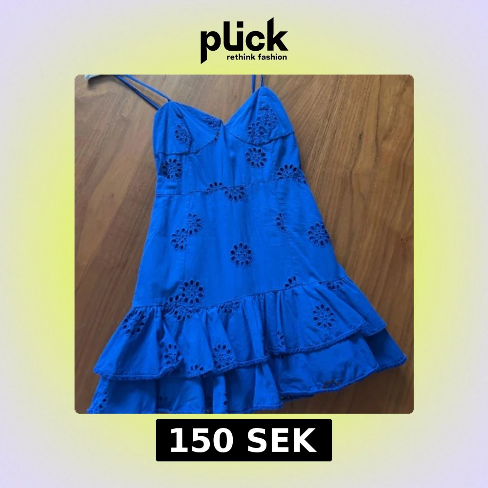 Säljer en blå kortklänning med smala axelband och volangkant nertill. Klänningen har broderade blommor och en lätt v-ringning. Perfekt för varma dagar och sommarens alla tillfällen.