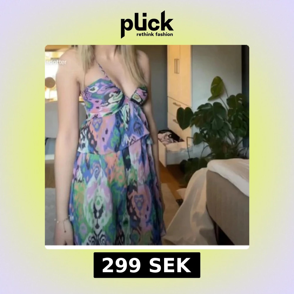 Superfin kortklänning med tunna axelband och v-ringning. Klänningen har ett färgstarkt abstrakt mönster i blått, grönt, rosa, lila och svart samt volangdetalj framtill. Perfekt för sommardagar när du vill sticka ut lite extra.