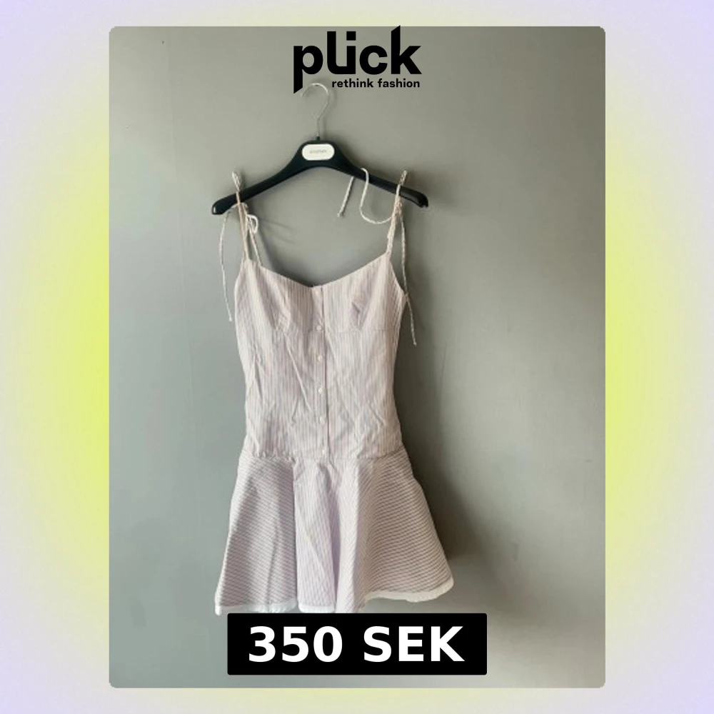 Söt populär kort klänning med tunna axelband som knyts på axlarna. Klänningen är vit med tunna vertikala ränder i blått och har knappar framtill. Utsvängd kjol