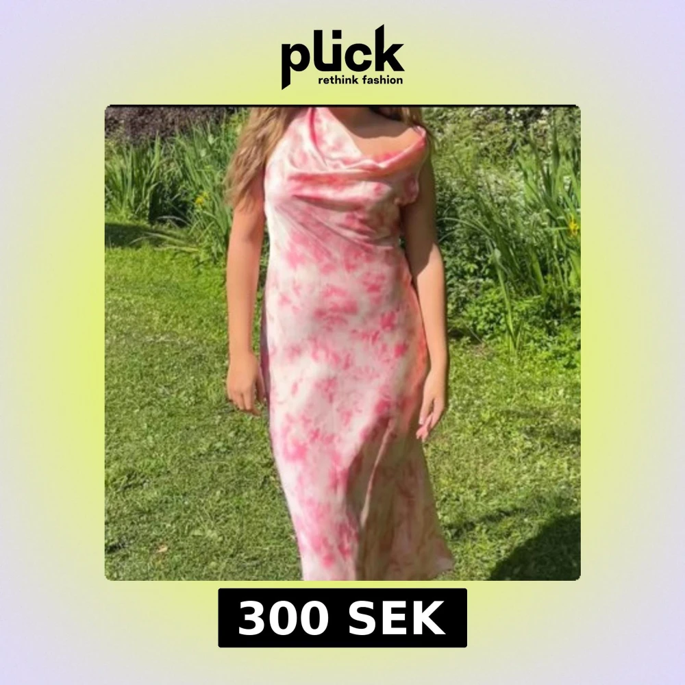 Supersnygg långklänning i satin med rosa och vitt mönster. Klänningen har en draperad urringning, smala axelband och öppen rygg med knyt. Sval och flowy passform, perfekt för varma dagar eller speciella tillfällen.