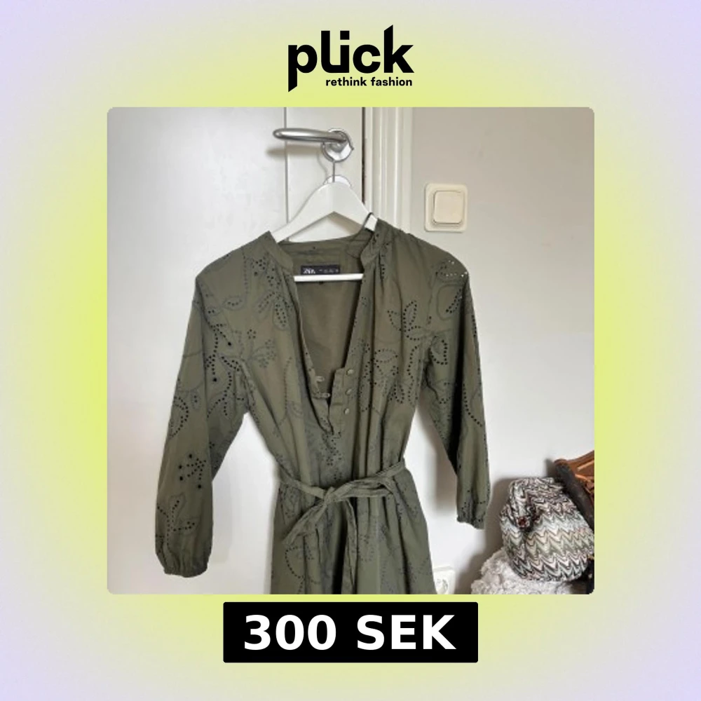 Olivgrön kortklänning från Zara med broderade detaljer och hålmönster. Klänningen har långa ärmar, knappar framtill och ett matchande knytbälte i midjan. Perfekt för dig som gillar en avslappnad men ändå snygg stil.