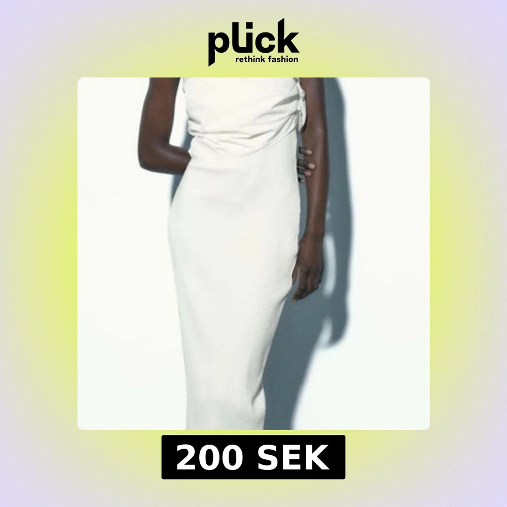 Säljer en elegant vit långklänning med ribbad struktur och omlottdetalj upptill. Klänningen har en figurnära passform och är ärmlös, perfekt för sommarens tillfällen. Materialet känns mjukt och följsamt mot kroppen. Sömmen vid dragkedjan har gått upp lite men går att fixa m nål och tråd