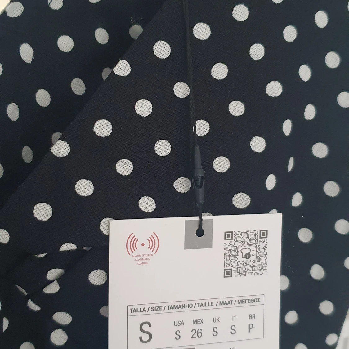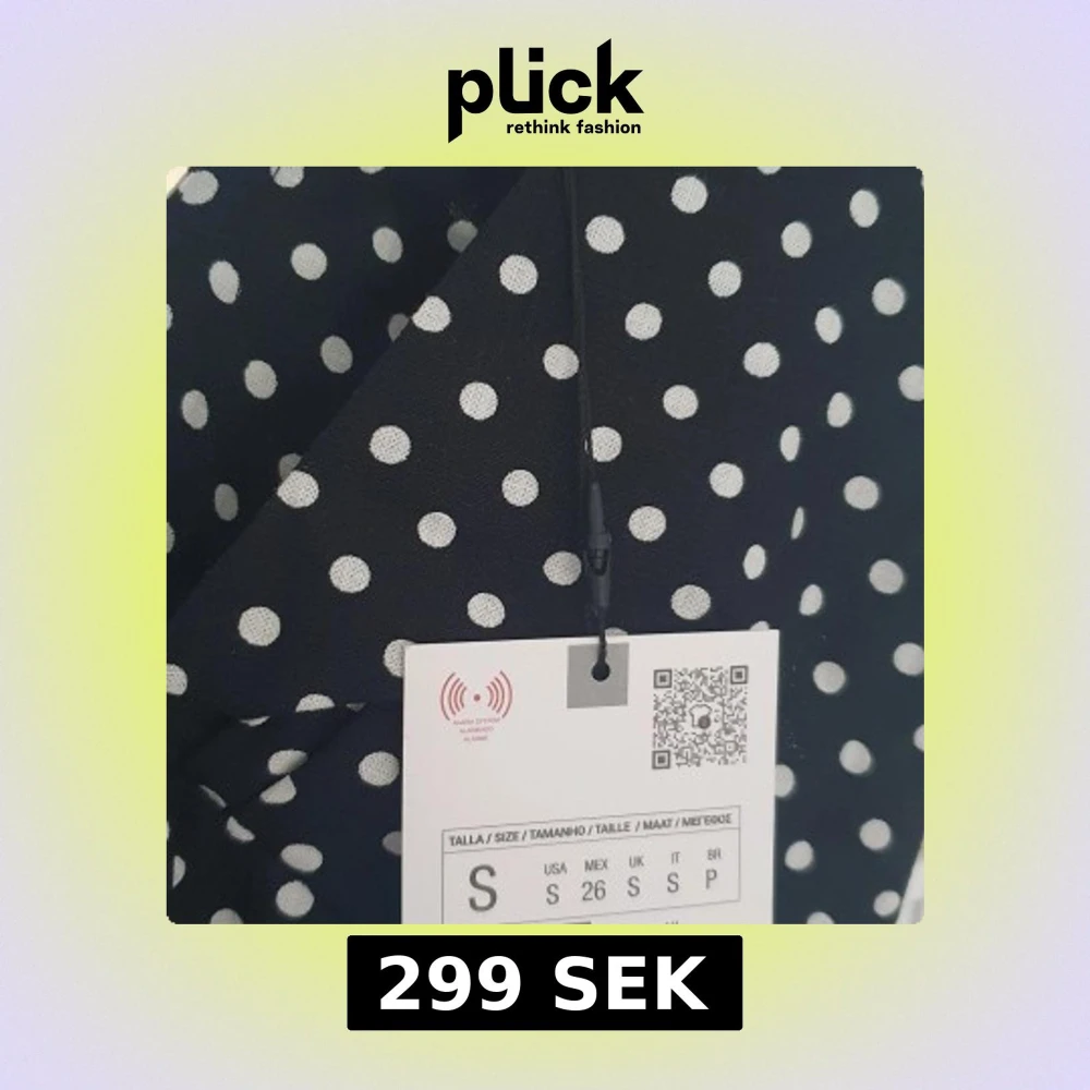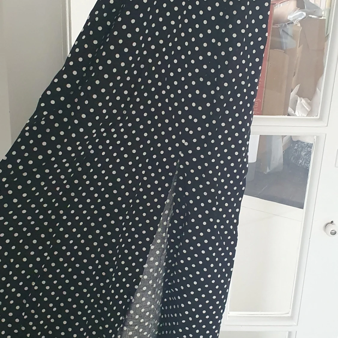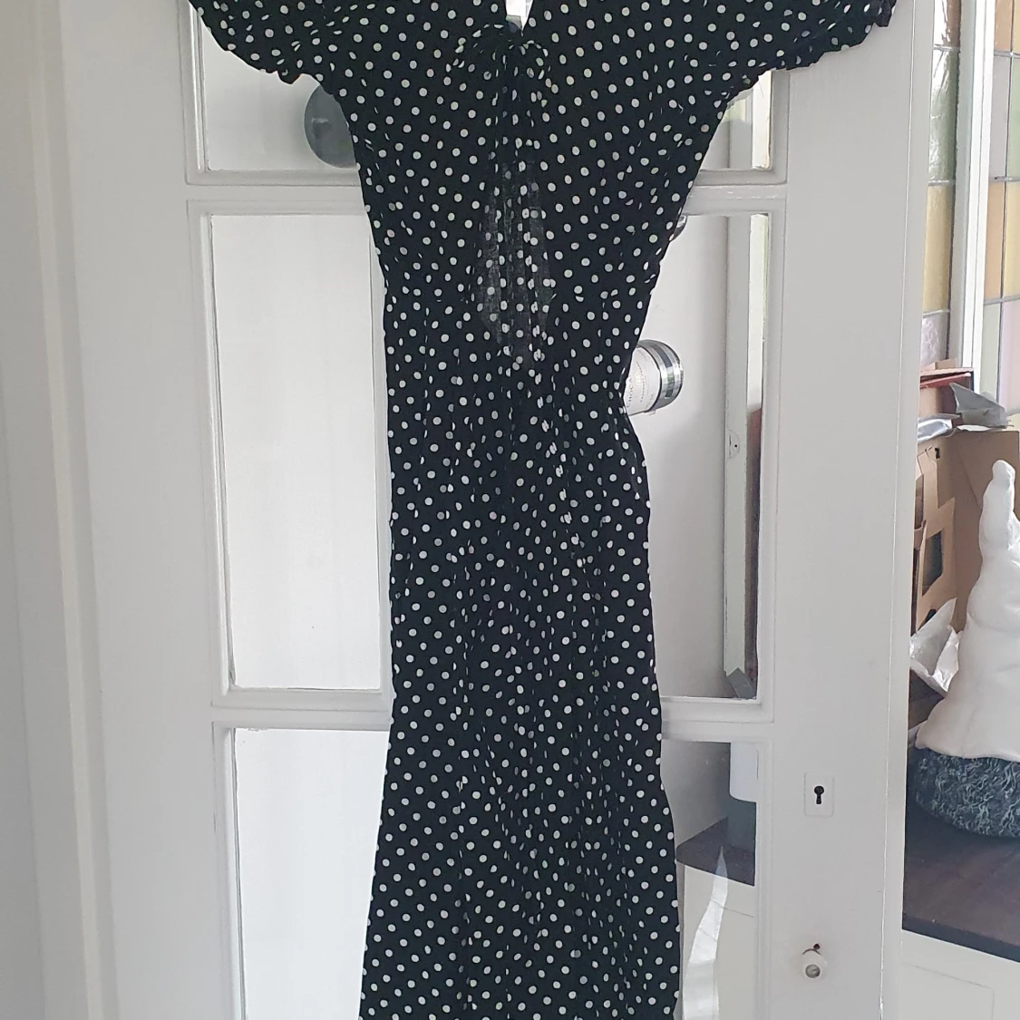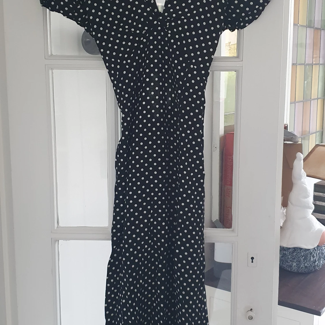 Supersnygg svart långklänning med vita prickar och slits framtill. Klänningen har korta ärmar, v-ringning och knyt i midjan för en smickrande siluett. Perfekt för dig som gillar retrovibbar och vill sticka ut med ett klassiskt mönster. Materialet känns lätt och luftigt.
