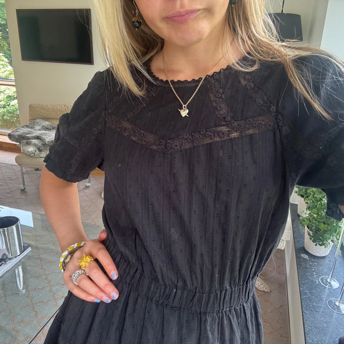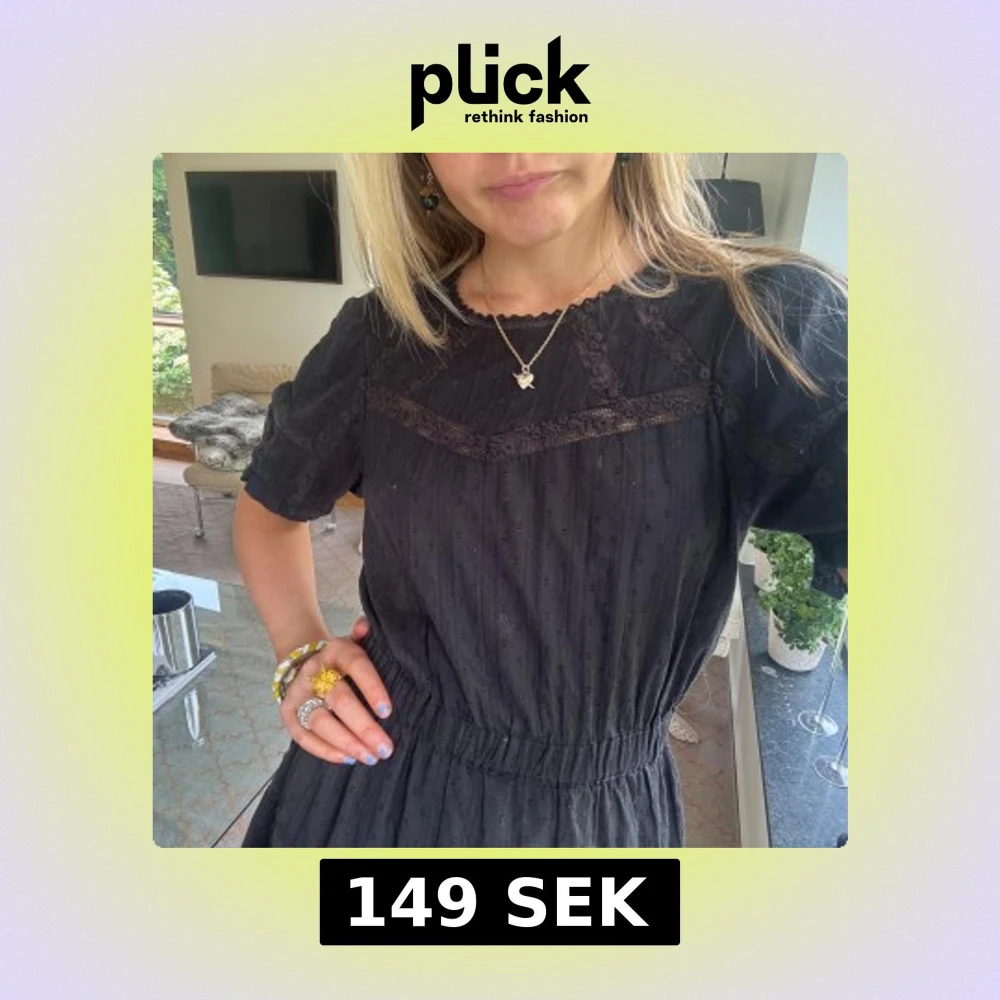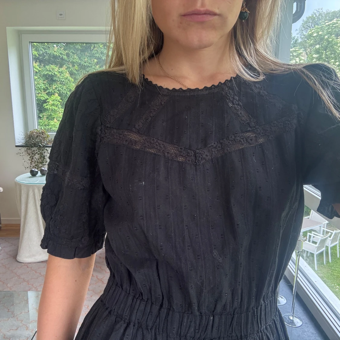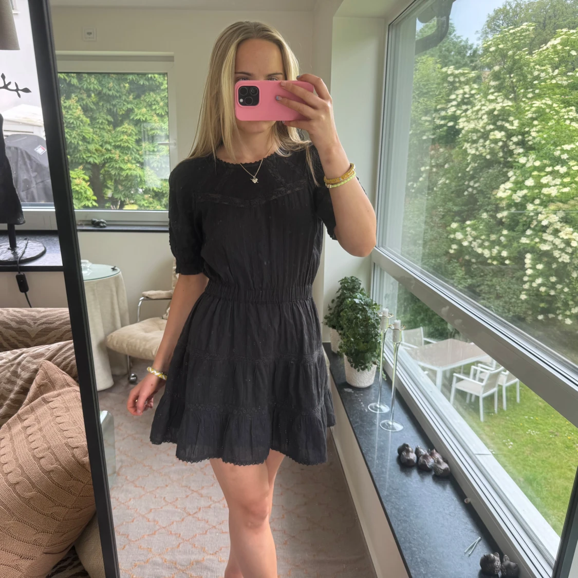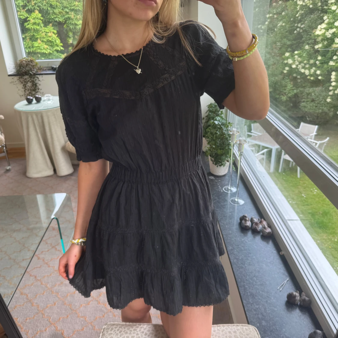 Supersöt svart kort klänning med resår i midjan och volangkant nertill. Klänningen har korta ärmar, spetsdetaljer och diskret struktur i tyget. Perfekt för dig som gillar en feminin och chill stil.