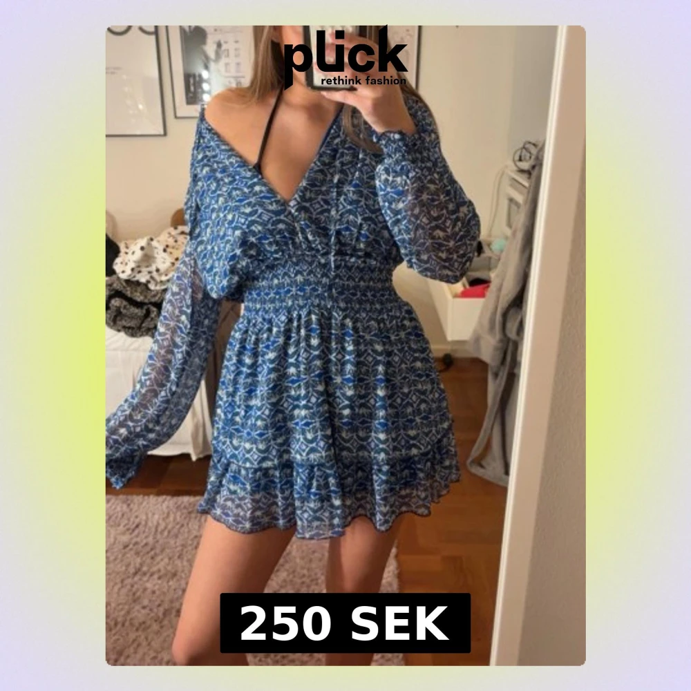 Säljer en blå kortklänning med vitt mönster och v-ringning. Klänningen har långa, transparenta ärmar och smockad midja som ger en snygg passform. Kjolen är volangig och tyget känns lätt och luftigt, perfekt för varmare dagar.