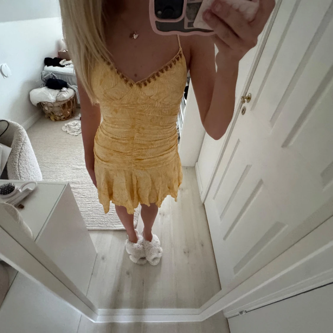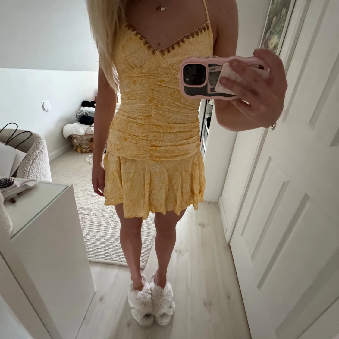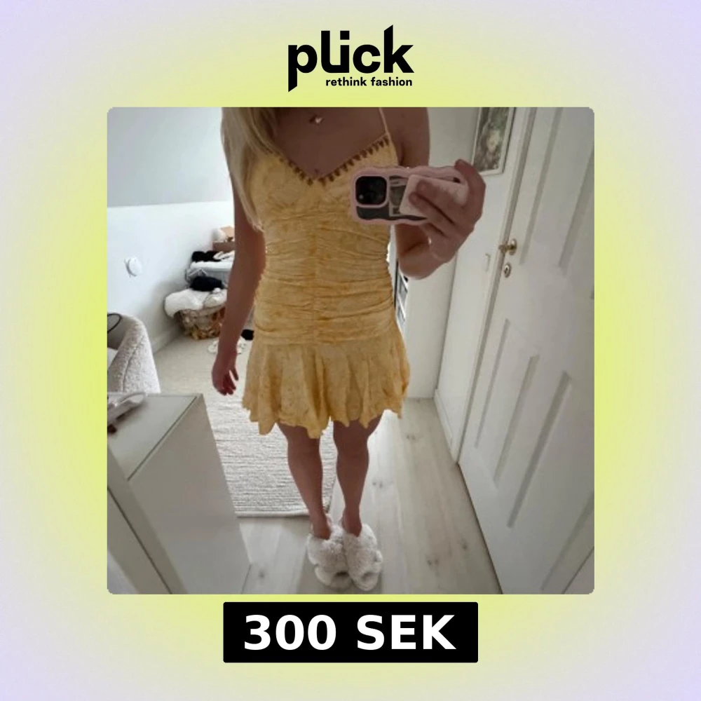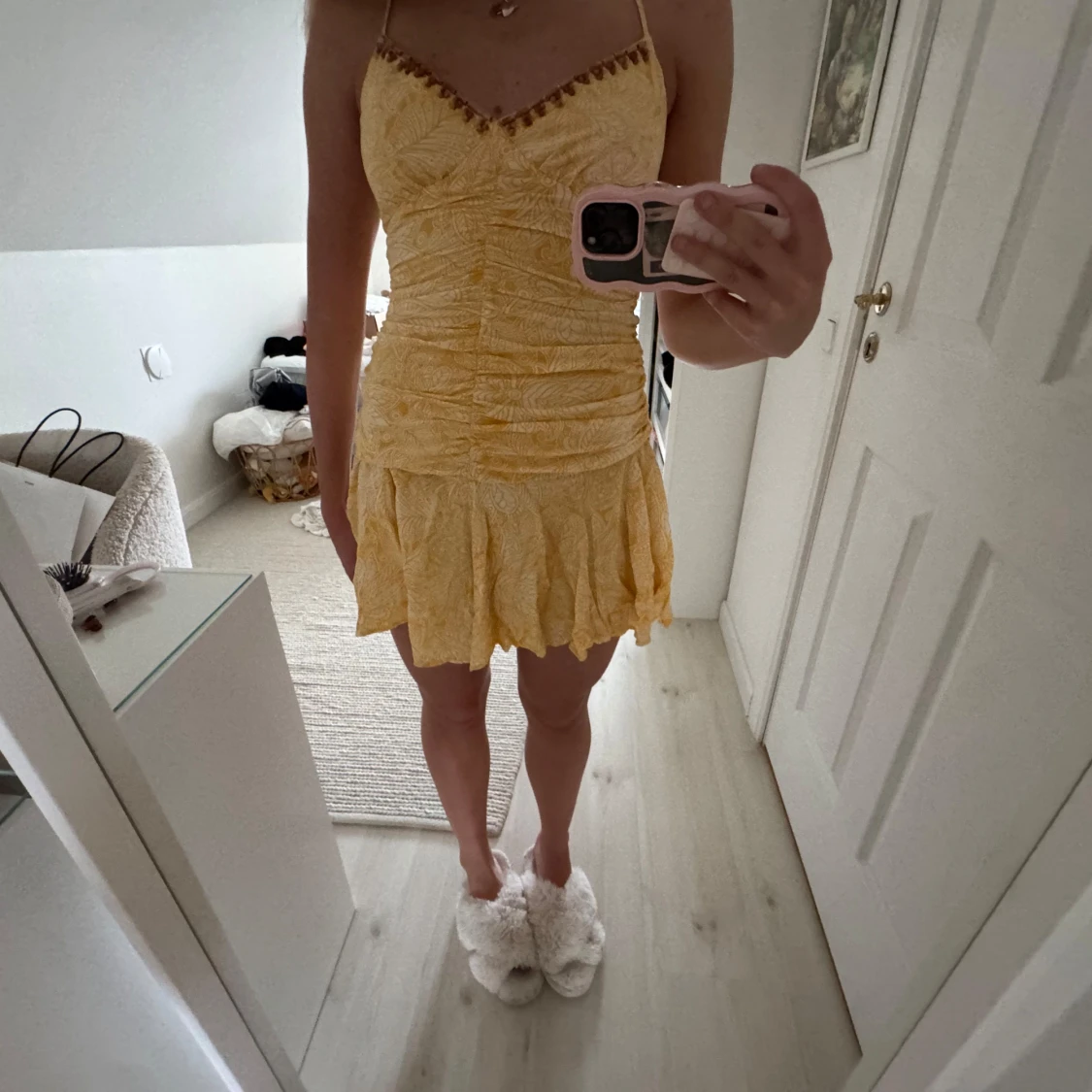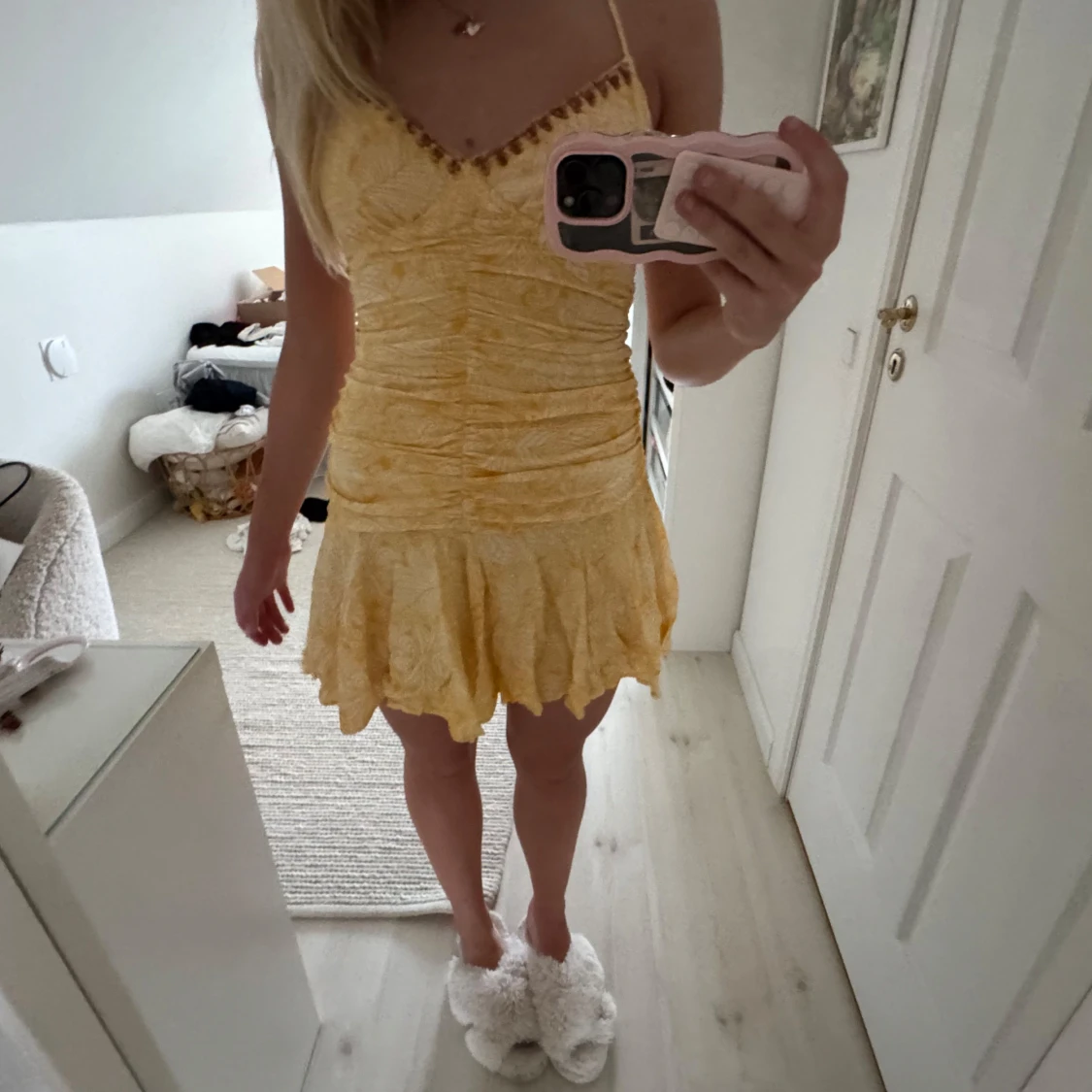 Superfin gul kort klänning med smala axelband och v-ringning dekorerad med små detaljer. Klänningen har rynkade partier över hela livet och en volangig kjol med ojämn kant. Tunt, lätt material med diskret blommönster och somrig vibe.