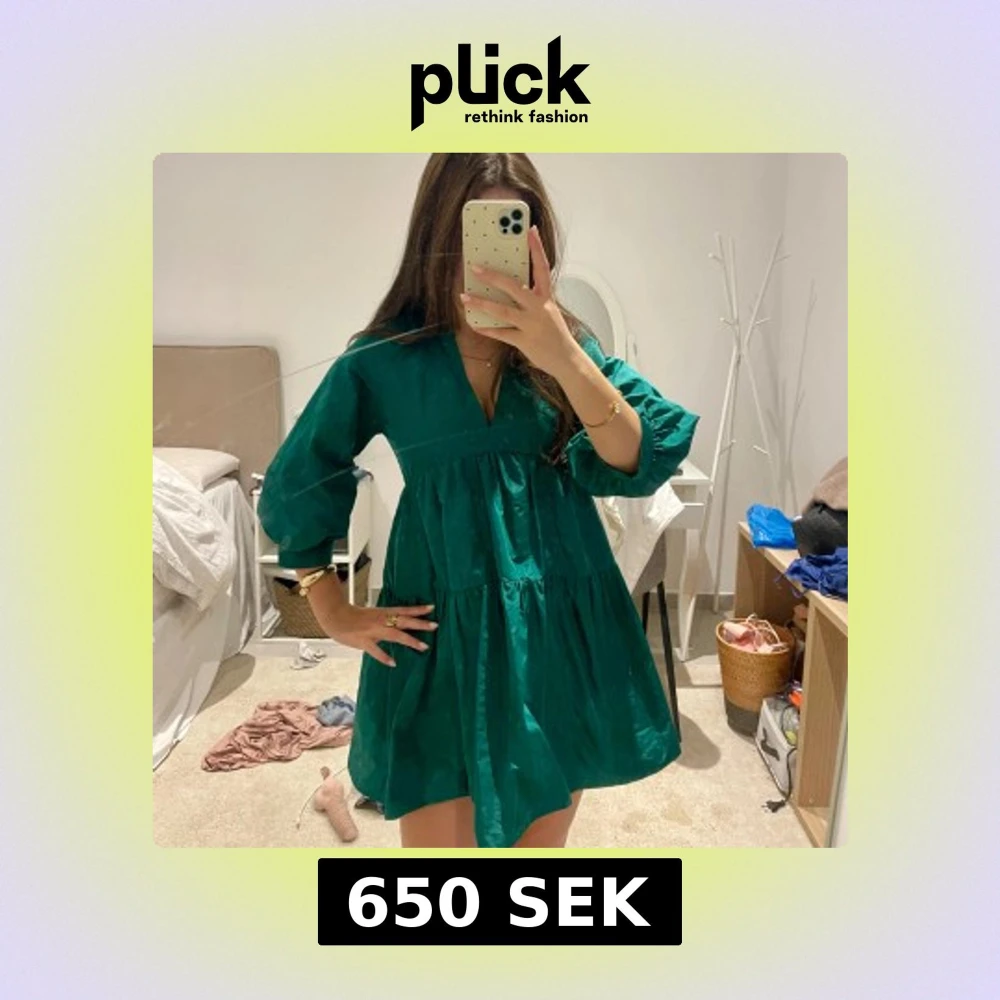 Supersöt grön kortklänning från Zara med v-ringning och voluminösa trekvartsärmar. Klänningen har en luftig passform med flera volanger och är tillverkad i bomull. Perfekt för dig som gillar en avslappnad men trendig look.