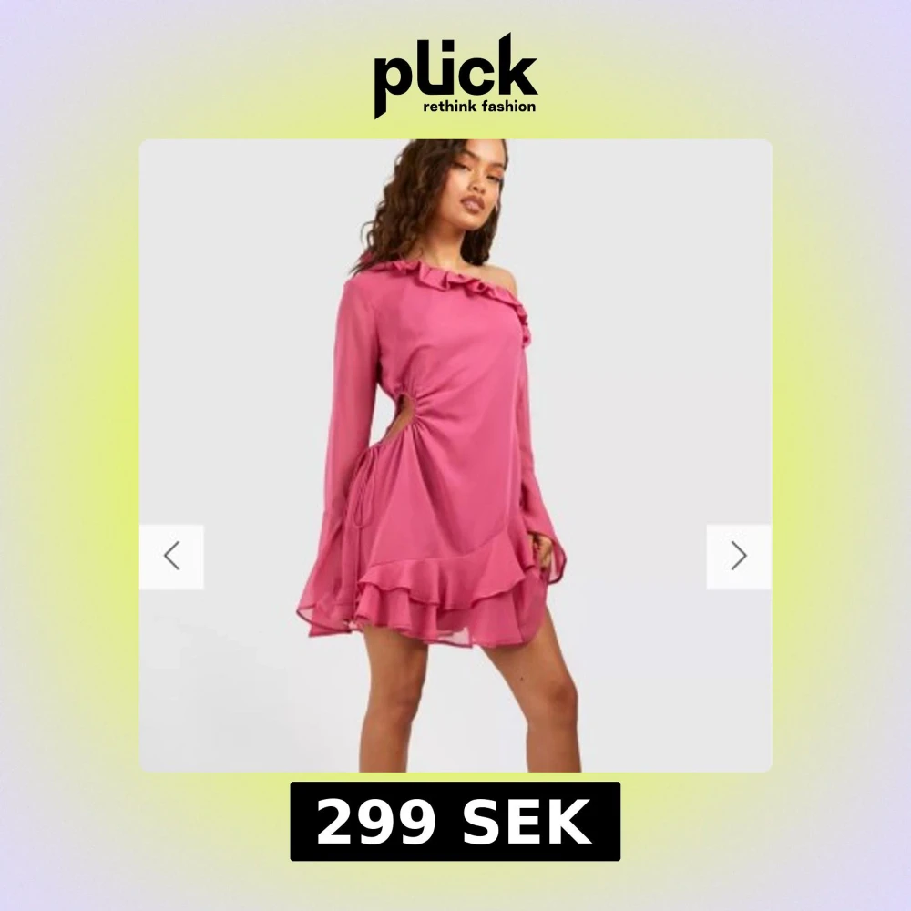 Helt oanvänd och ny med prislappen kvar. Snygg rosa offshoulder klänning med volangdetaljer och lång ärm. Klänningen har en unik design med snörning i sidan och en luftig, fladdrig kjol. Perfekt för en trendig look!