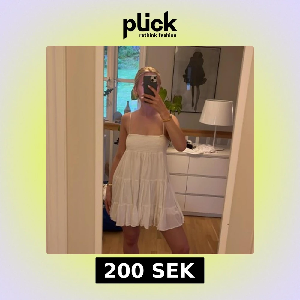 Säljer en söt vit kortklänning med smala axelband och smockad överdel. Klänningen har flera volanglager och är tillverkad i ett lätt, luftigt material som passar perfekt för varma dagar.