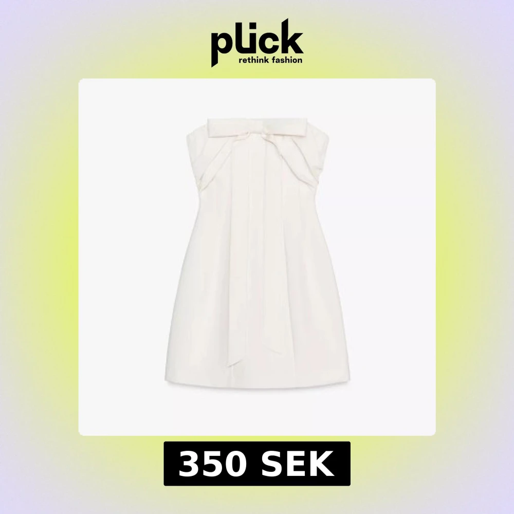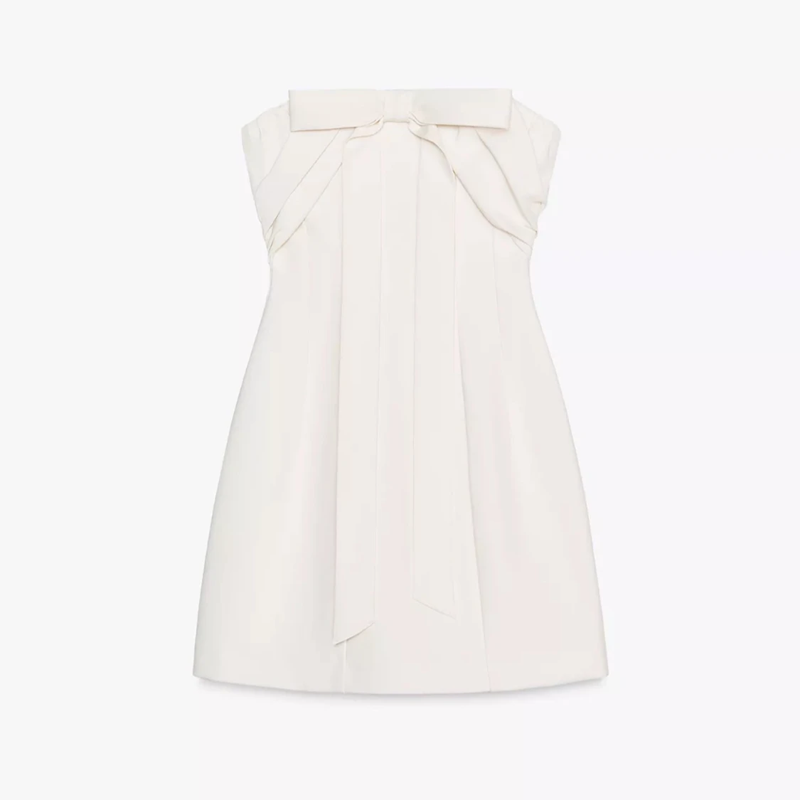 Superfin vit axelbandslös kortklänning med en stor dekorativ rosett framtill. Den är slutsåld på Zara. Nypris 599kr!!