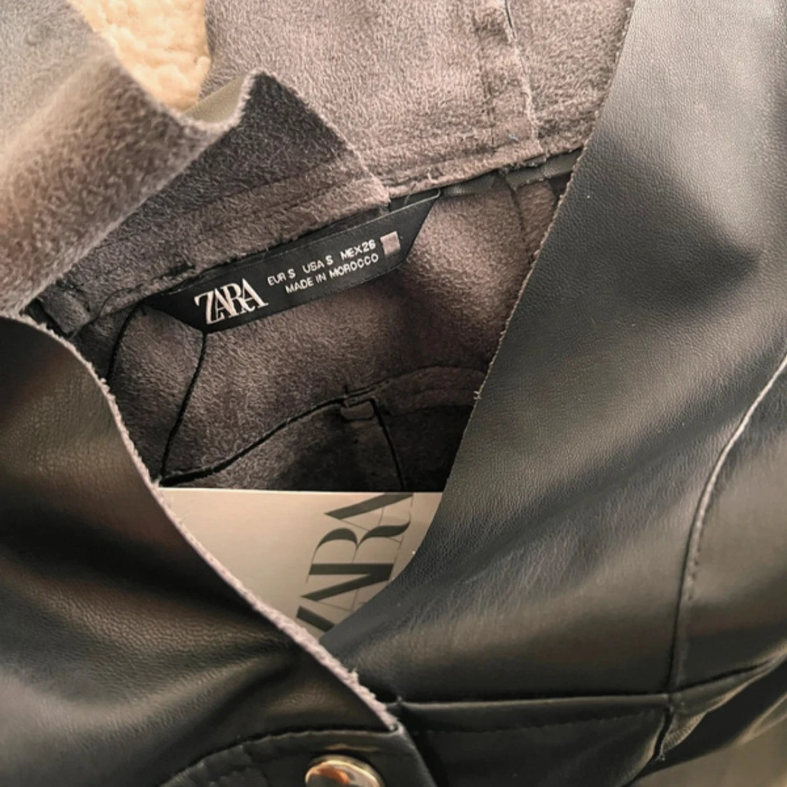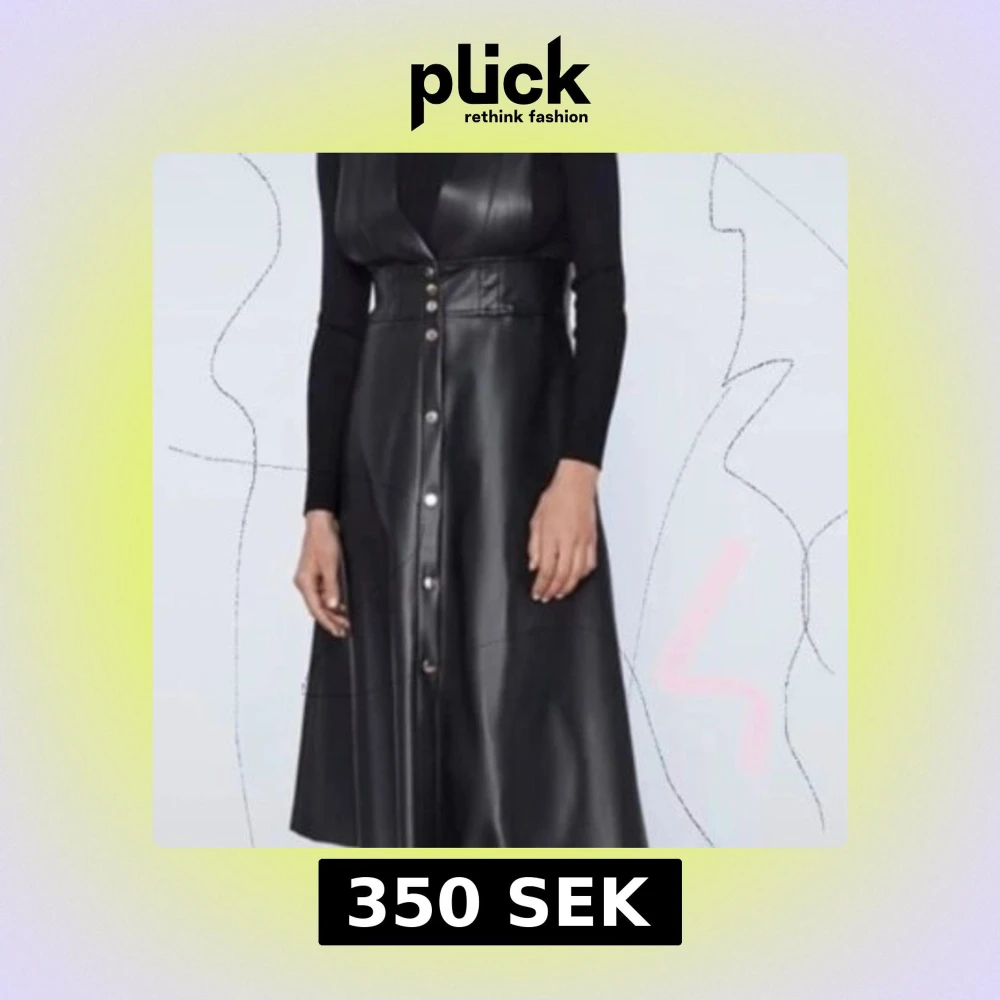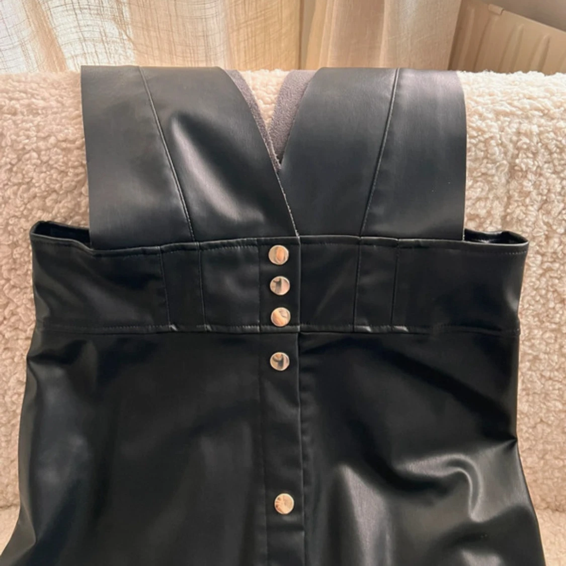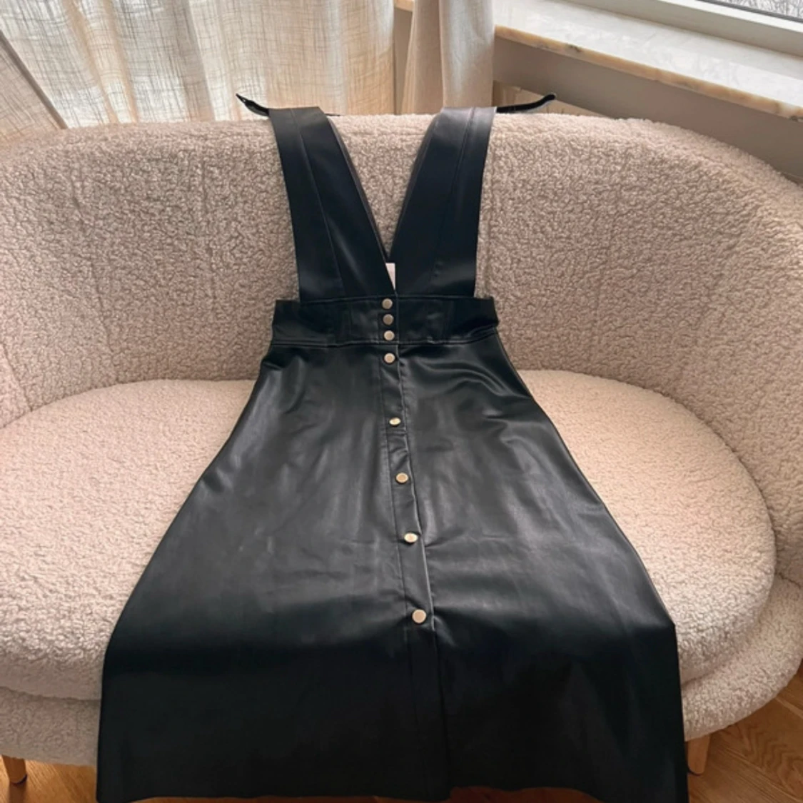 Cool svart långklänning från Zara i skinnimitation med breda axelband och knappar framtill. Klänningen har en markerad midja och v-ringad överdel, perfekt att styla med en tight topp under för en edgy look.