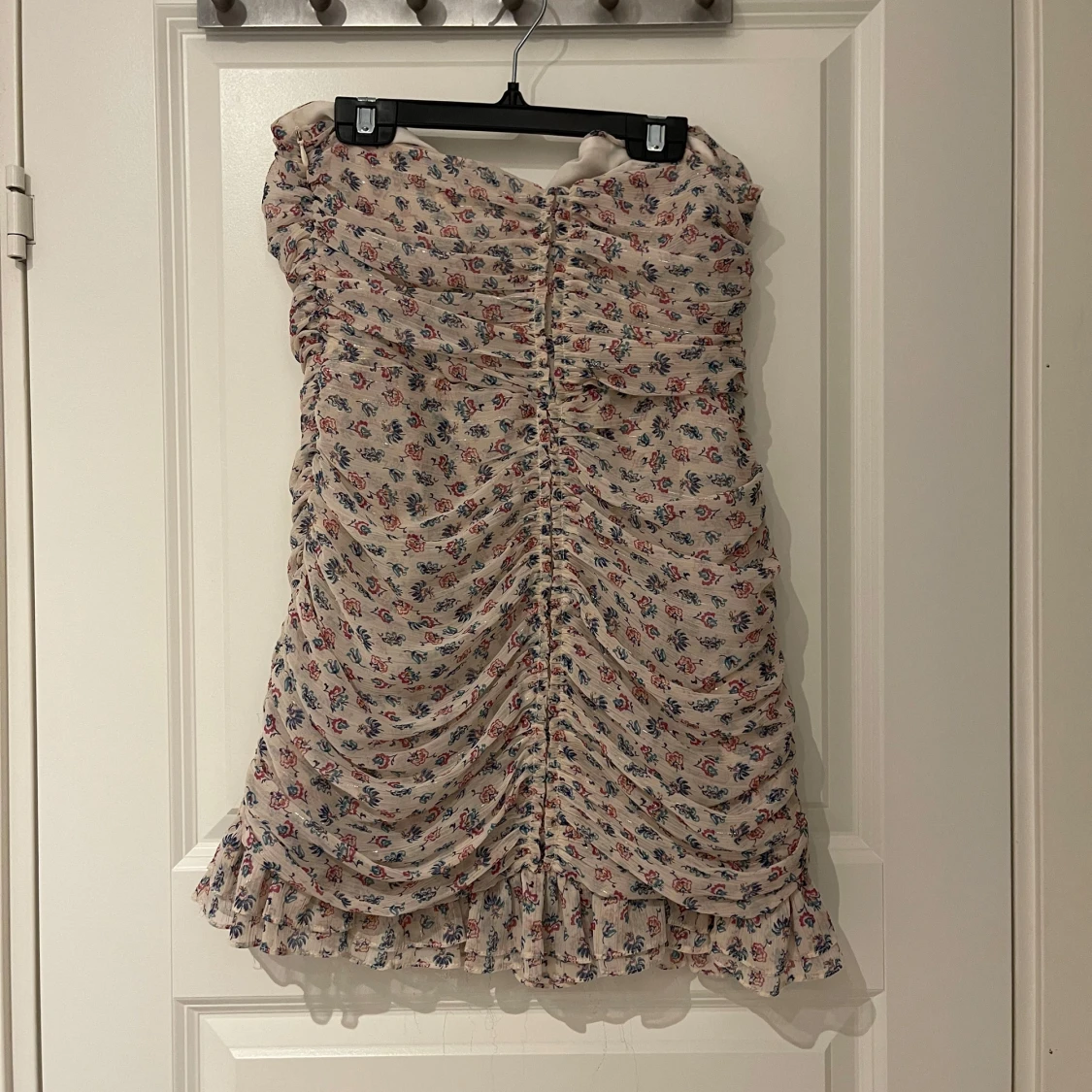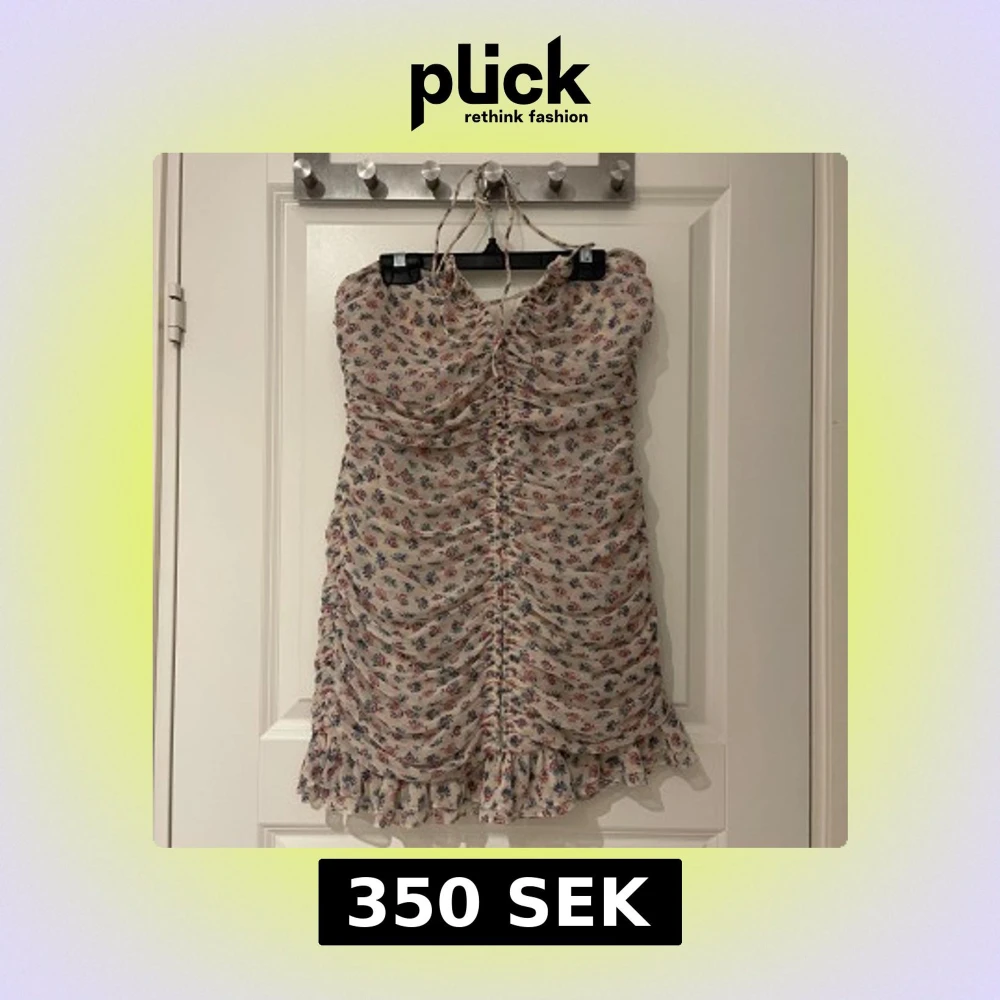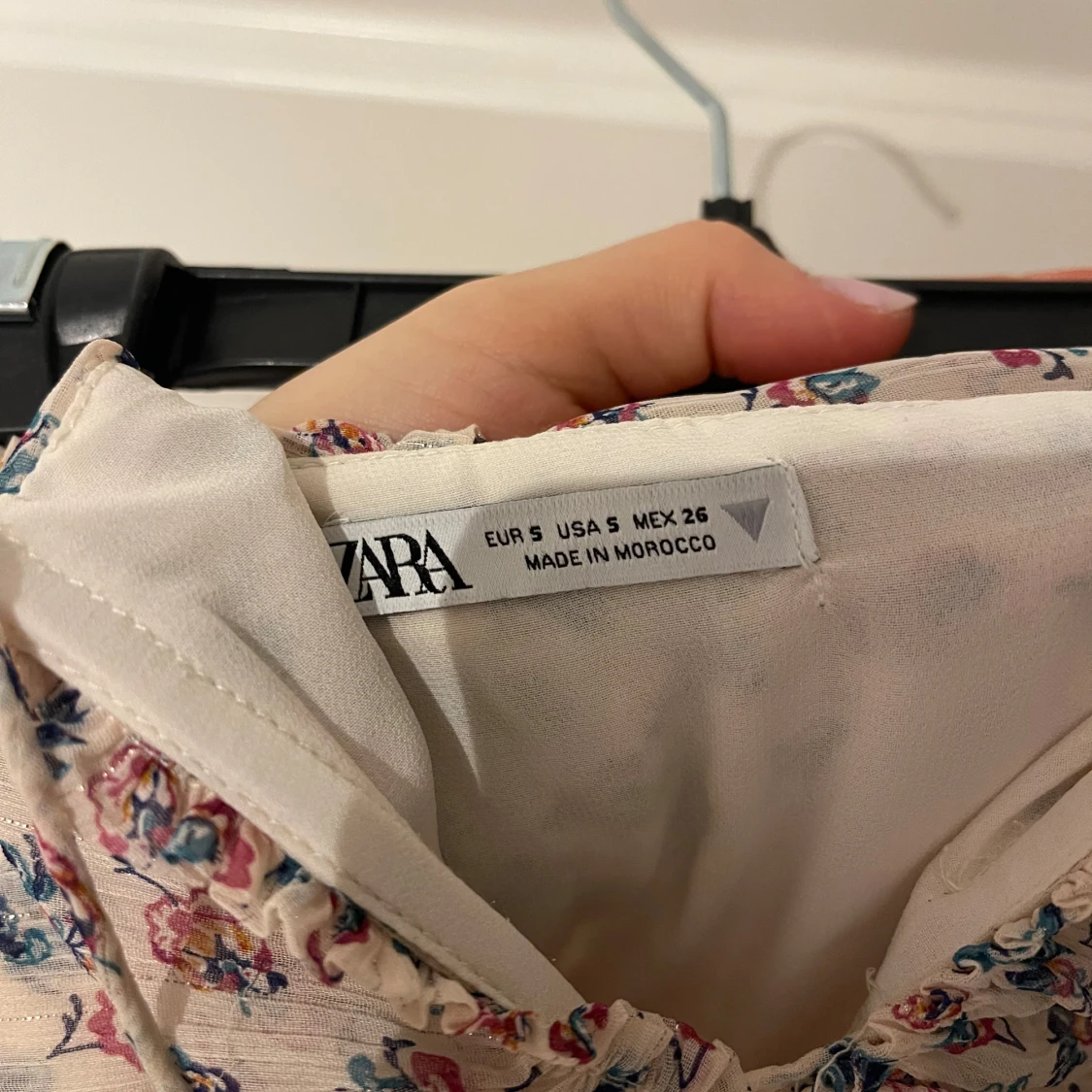 Supersöt kortklänning från Zara med blommigt mönster i flera färger. Klänningen har smala axelband som knyts i nacken, rynkade detaljer framtill och volang längst ner. Perfekt för sommarens alla tillfällen!