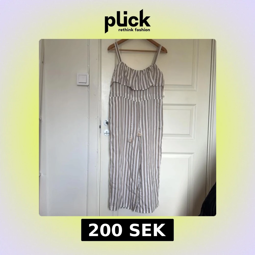 Superfin jumpsuit från Zara Basic i beige och vitt med vertikala ränder. Jumpsuiten har smala axelband, volang upptill och ett flätat knytband med tofsar i midjan. Perfekt för varma dagar och har en luftig känsla tack vare materialet i bomull. Pris kan diskuteras!