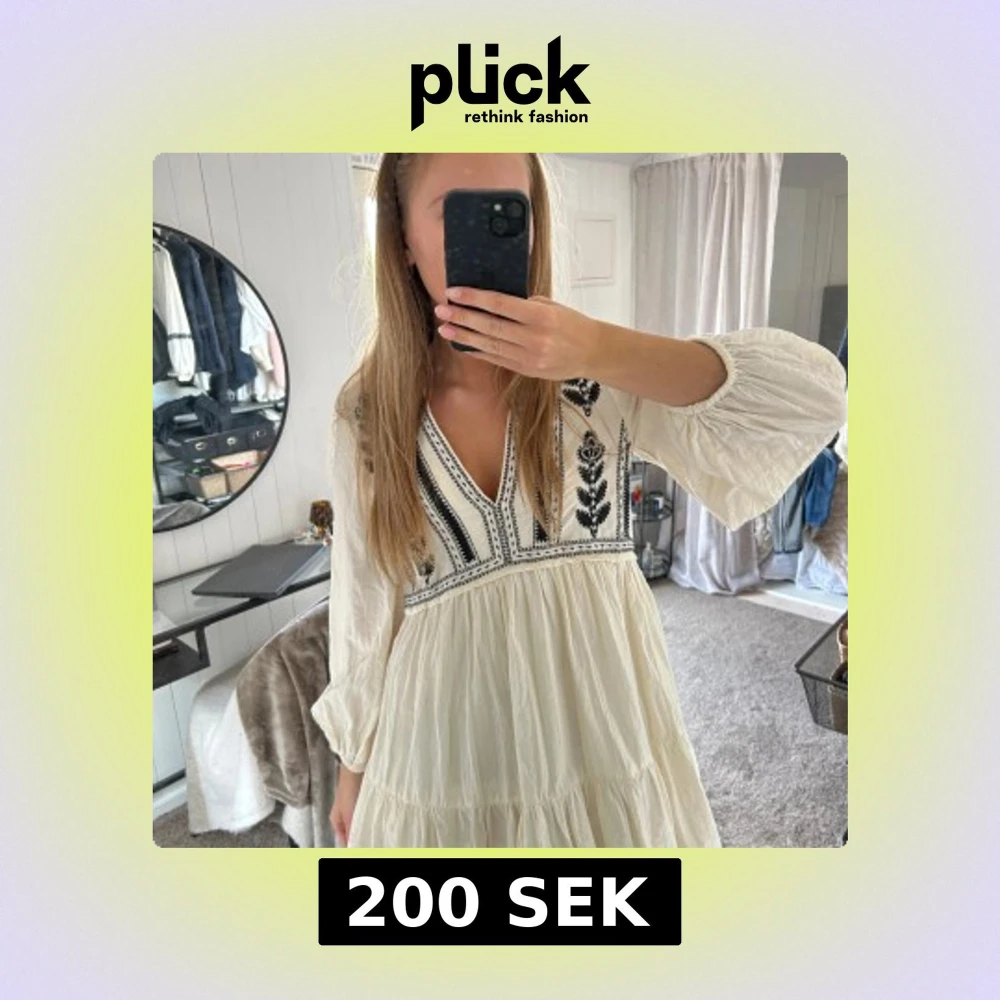 Superfin beige kortklänning från Zara med svart broderat blommönster och v-ringad hals. Klänningen har långärmade puffärmar och är gjord i mjuk bomull. Den har en flowy passform och snygga detaljer vid midjan. Perfekt för dig som gillar boho vibes och coola broderier. Använd 1 gång