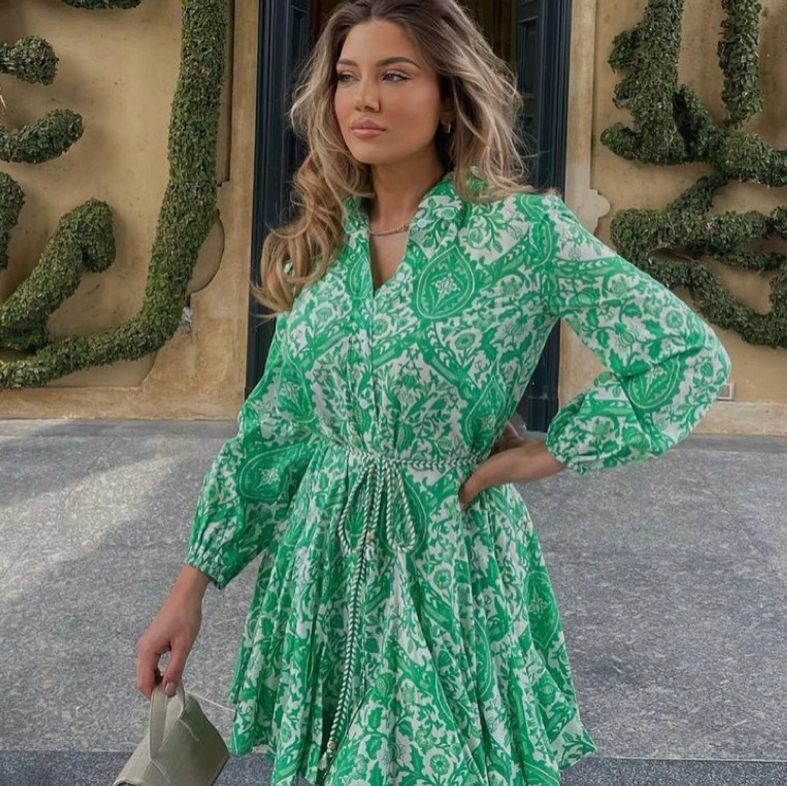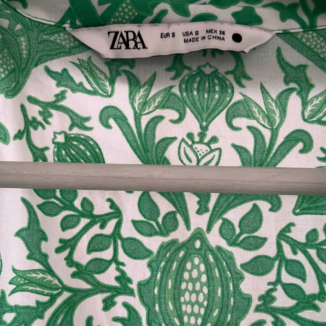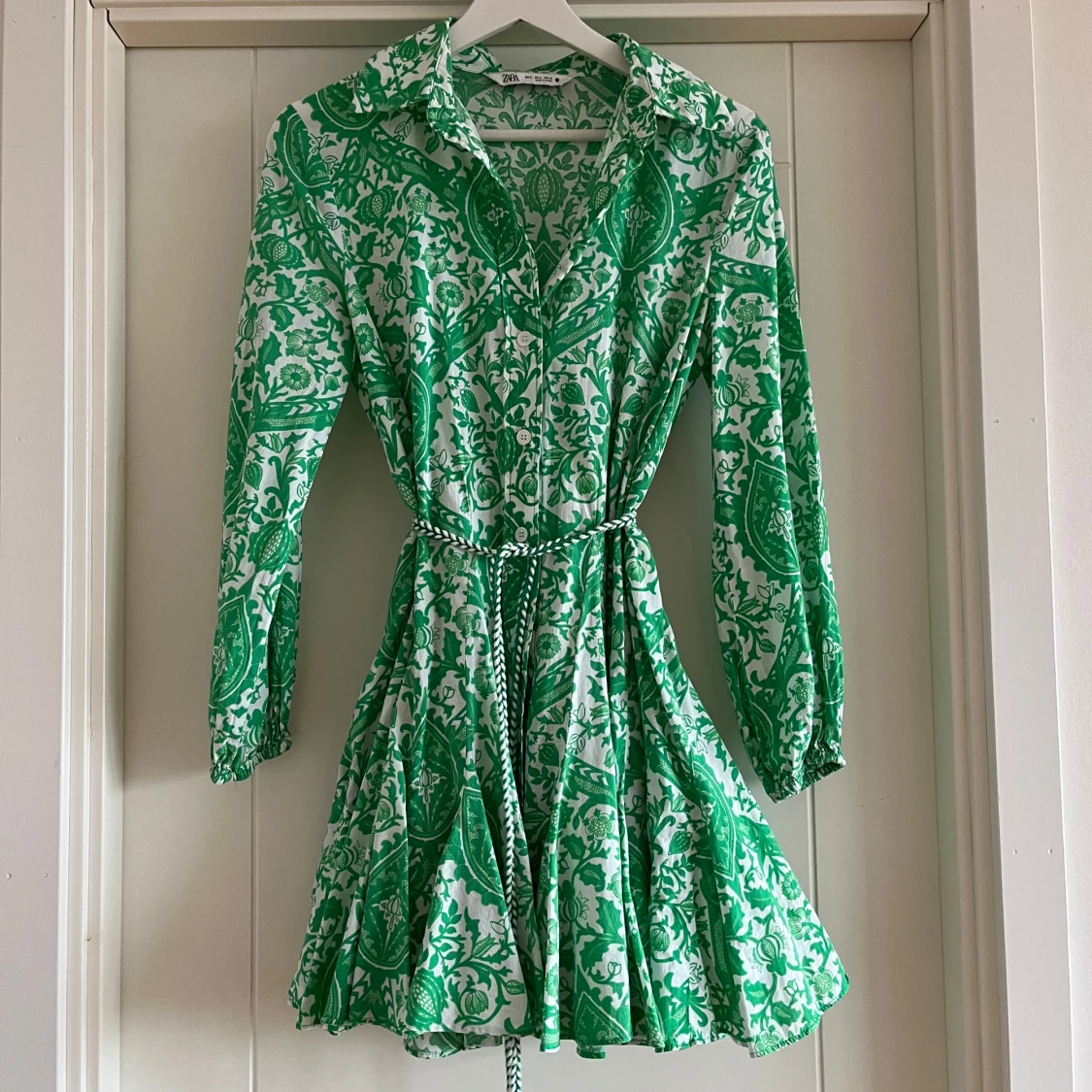 Snygg grön och vit klänning från Zara med ett blommigt mönster🌸🍀. Klänningen har långa ärmar och en knytning i midjan som ger en fin passform. Perfekt för en somrig look samt för en mysig middag ute. Klänningen har ett luftigt material, skönt när det är varmt. Lämna gärna ett prisförslag!!🤩🤩 (3.e bild är lånad)