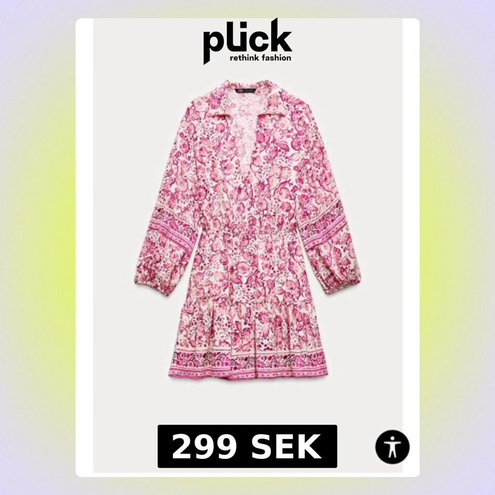 Superfin kortklänning från Zara med rosa och vita blommor, v-ringning och långa ärmar. Klänningen har markerad midja och volang nertill, perfekt för sommarens alla tillfällen. Lätt och luftig i bomullsmaterial.